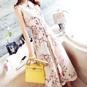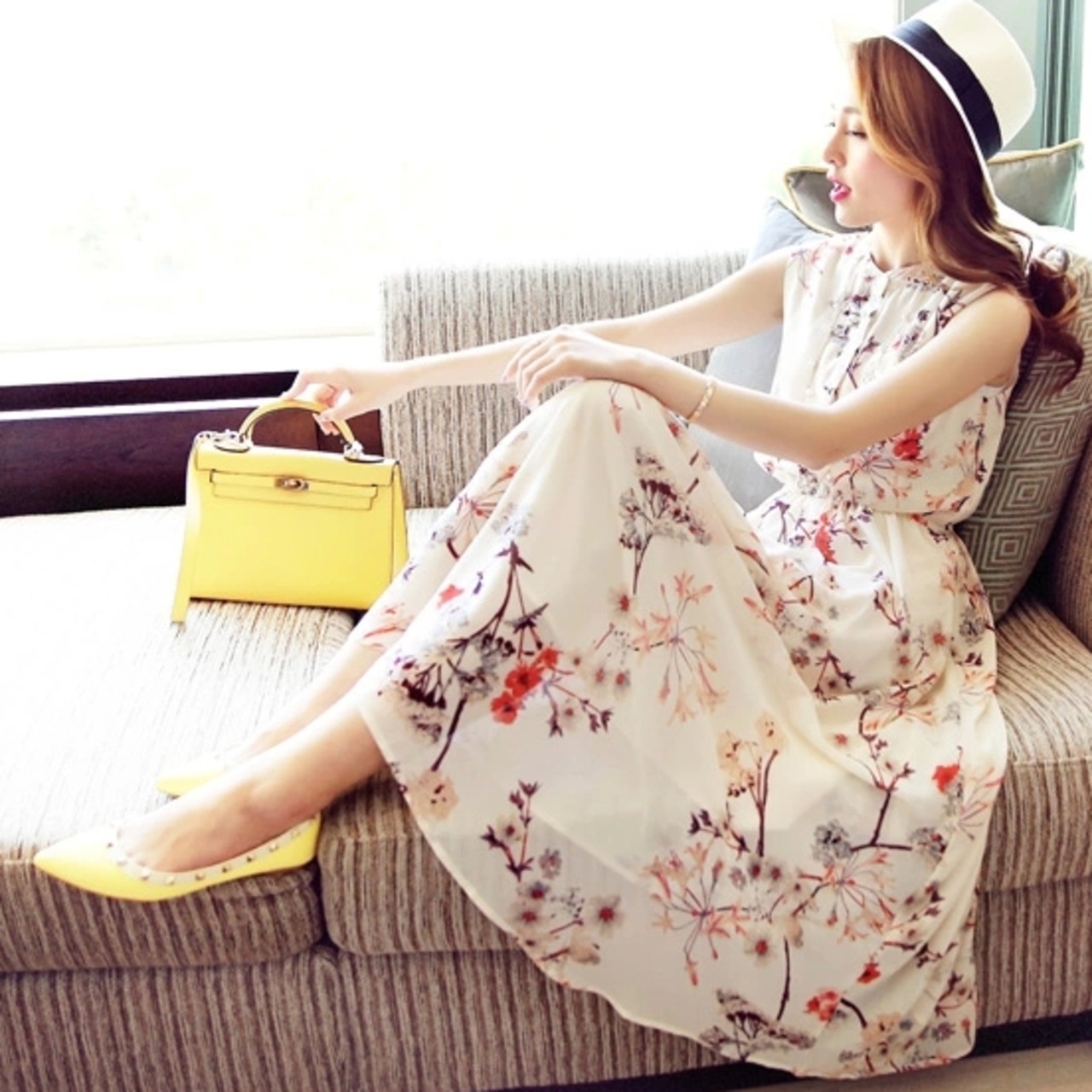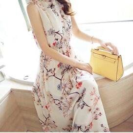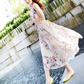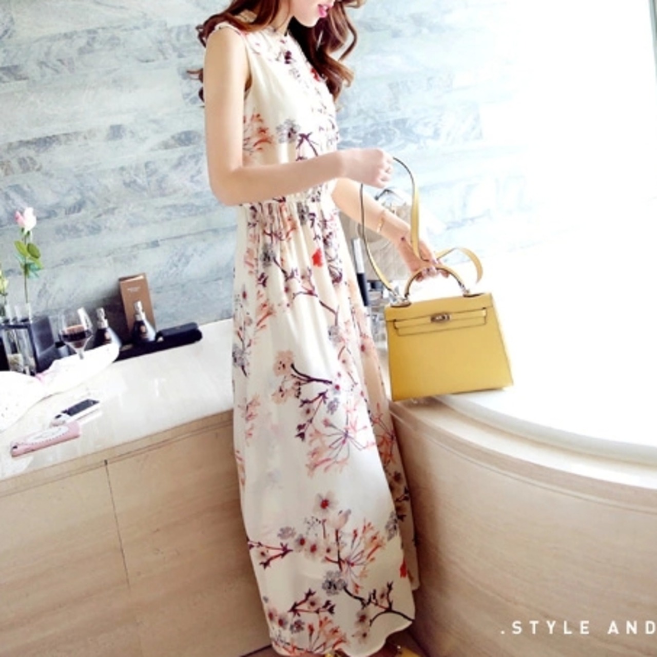 桜のプリントがフェミニンなロング丈のノースリーブワンピ。