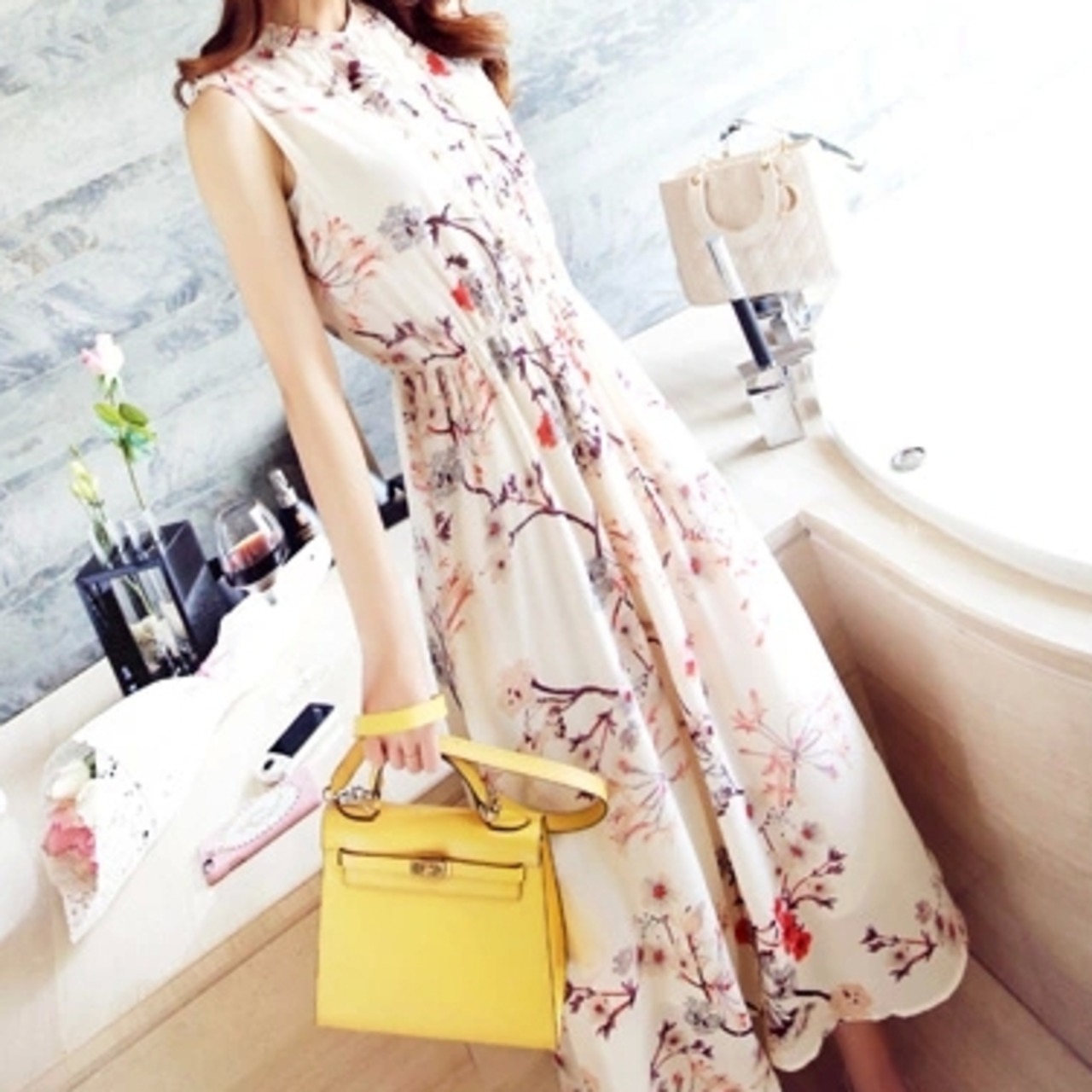 フレアワンピース Aライン 膝下 桜 ミモレ丈 ノースリーブ バンドカラー 透け感 薄手 柄 花柄 フラワー ボタニカル 大人可愛い きれいめ シンプル 大人 上品 おしゃれ フェミニン レトロ エキゾチック 大人女子 こなれ感 キュート ガーリー エレガント 存在感 抜け感 ナチュラル 華やか ロマンティック アジアン 春 夏 レディース OL 学生 通学 デート お出かけ 女子会 お泊まり 休日 パーティー イベント 旅行 海 ホテル レストラン 着回し 普段使い