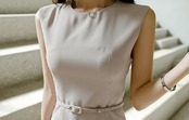 シンプルで美しいシルエットのボートネックのノースリーブワンピース。