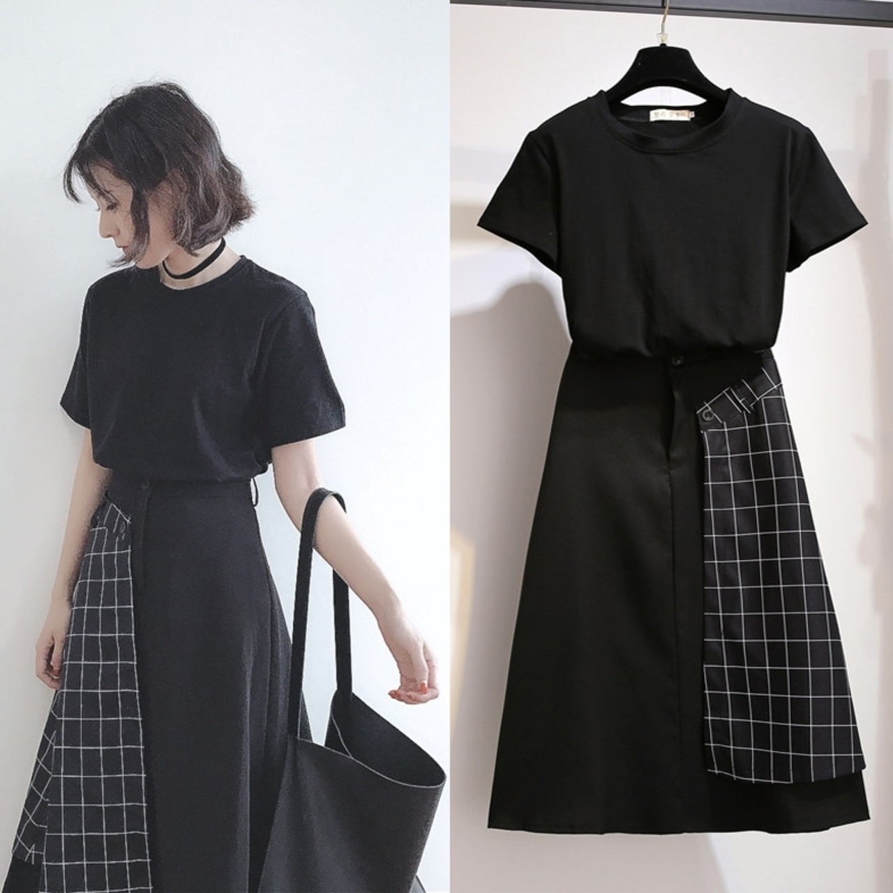 セットアップ ツーピース Tシャツ スカート 2点セット ラウンドネック 半袖 チェック柄 格子柄 アシンメトリー フレア ハイウエスト ミディアム丈 着回し 大人女子 大人可愛い カジュアル お出かけ デイリー 普段使い ランチ カフェ リゾート 大きいサイズ レディース