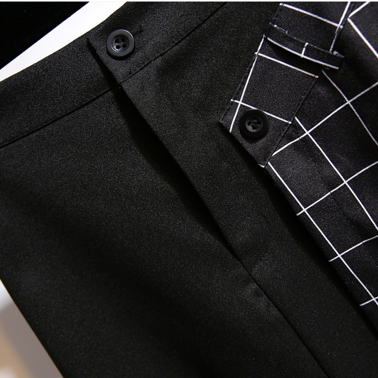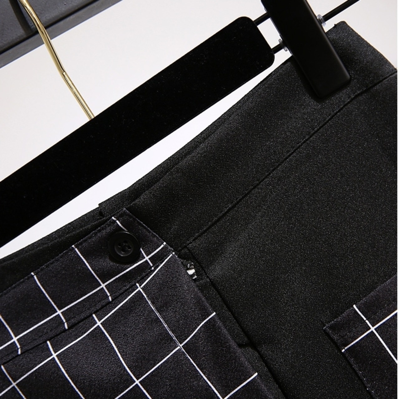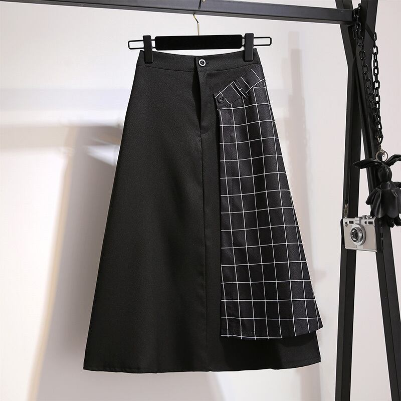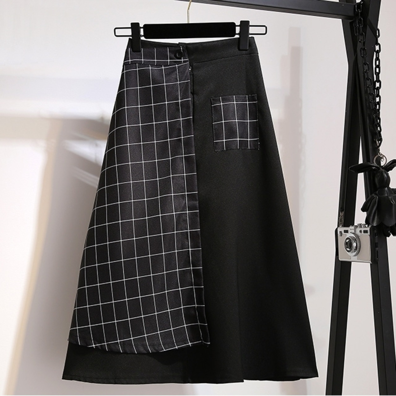 チェック柄を不規則に組み合わせたスカートが個性的。