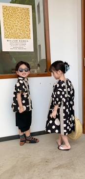 【商品説明】男の子と女の子 かっこいいペアルック黒白ドットコーデです。 水玉模様のワンピース と黒パンツスタイルの2種類です。