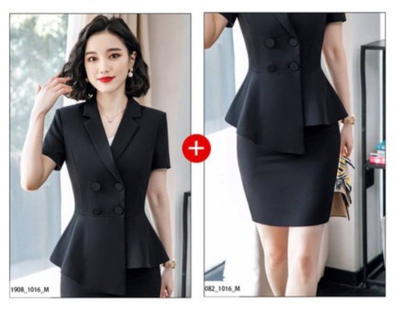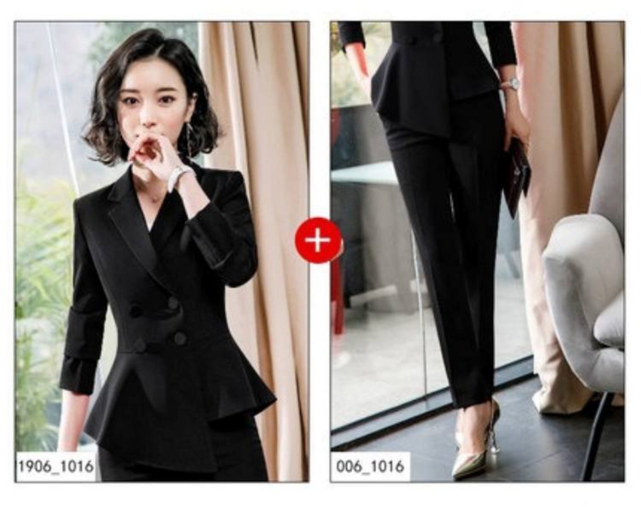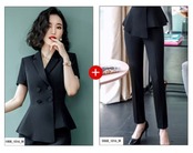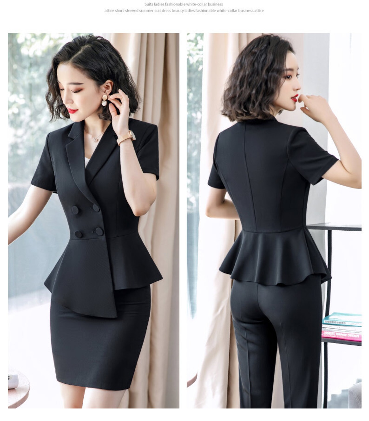 ダブルブレストのトップスとタイトスカート、ストレートパンツのセットアップです。