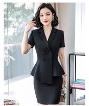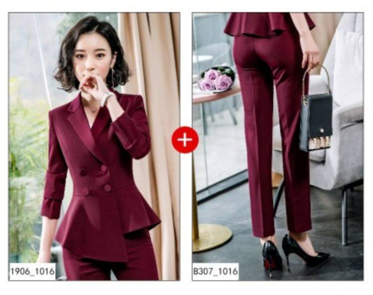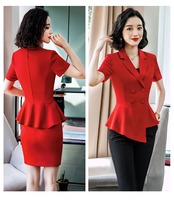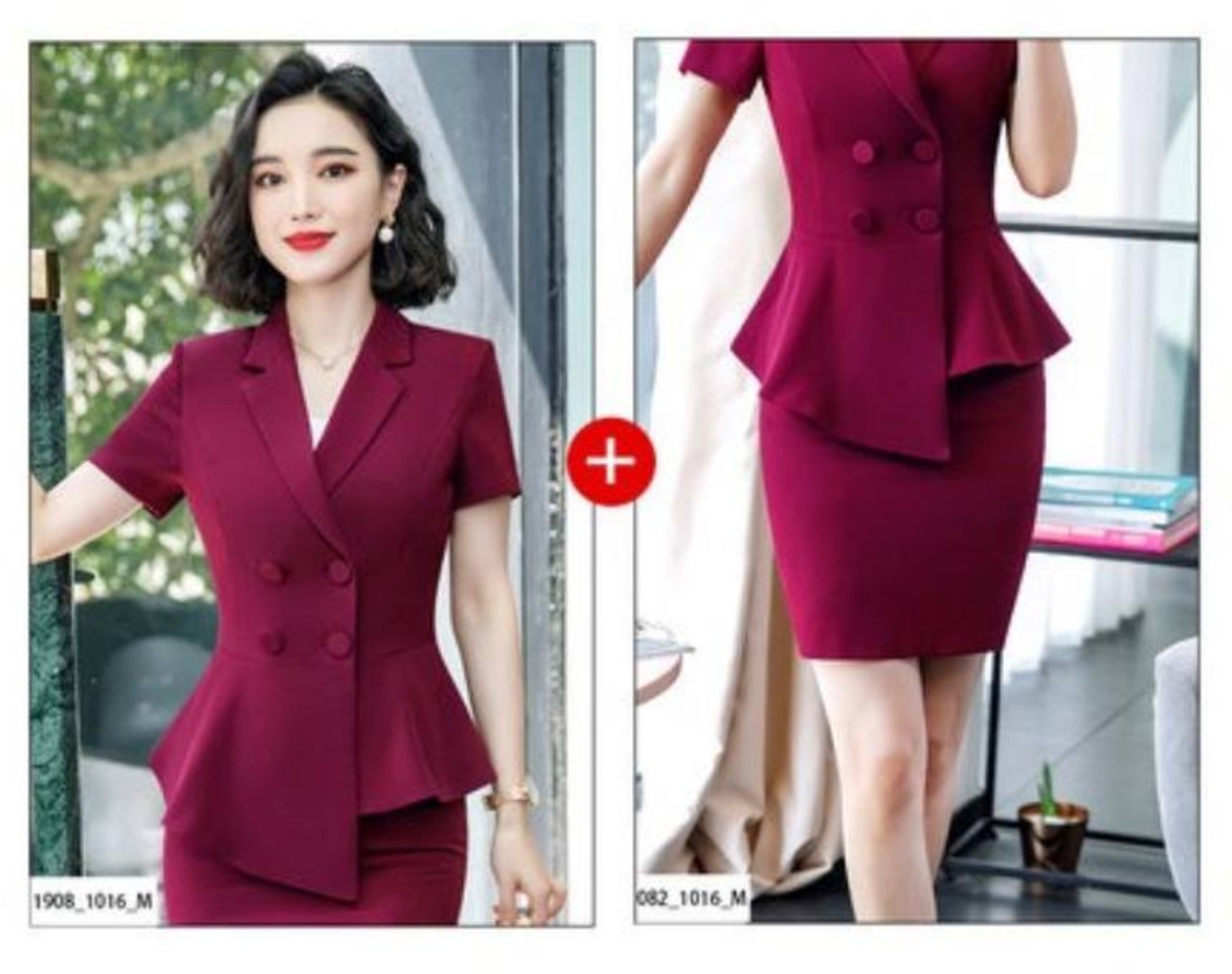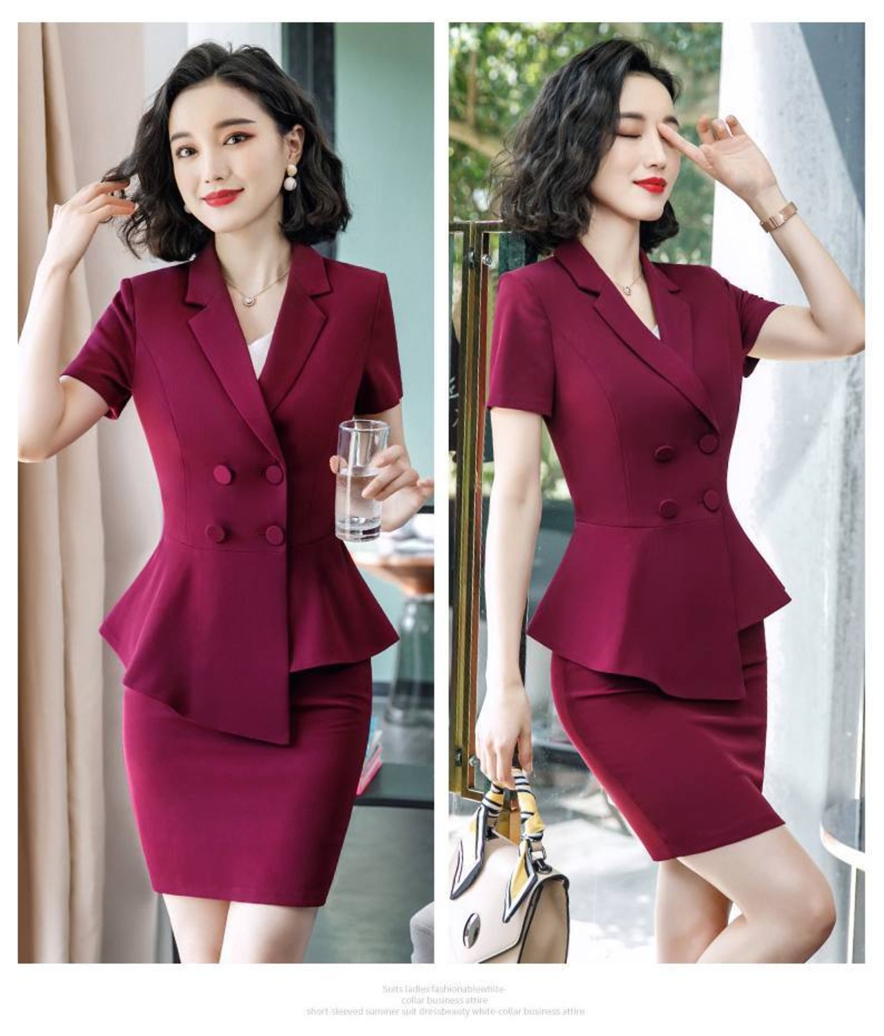 ダブルブレストのトップスとタイトスカート、ストレートパンツのセットアップです。