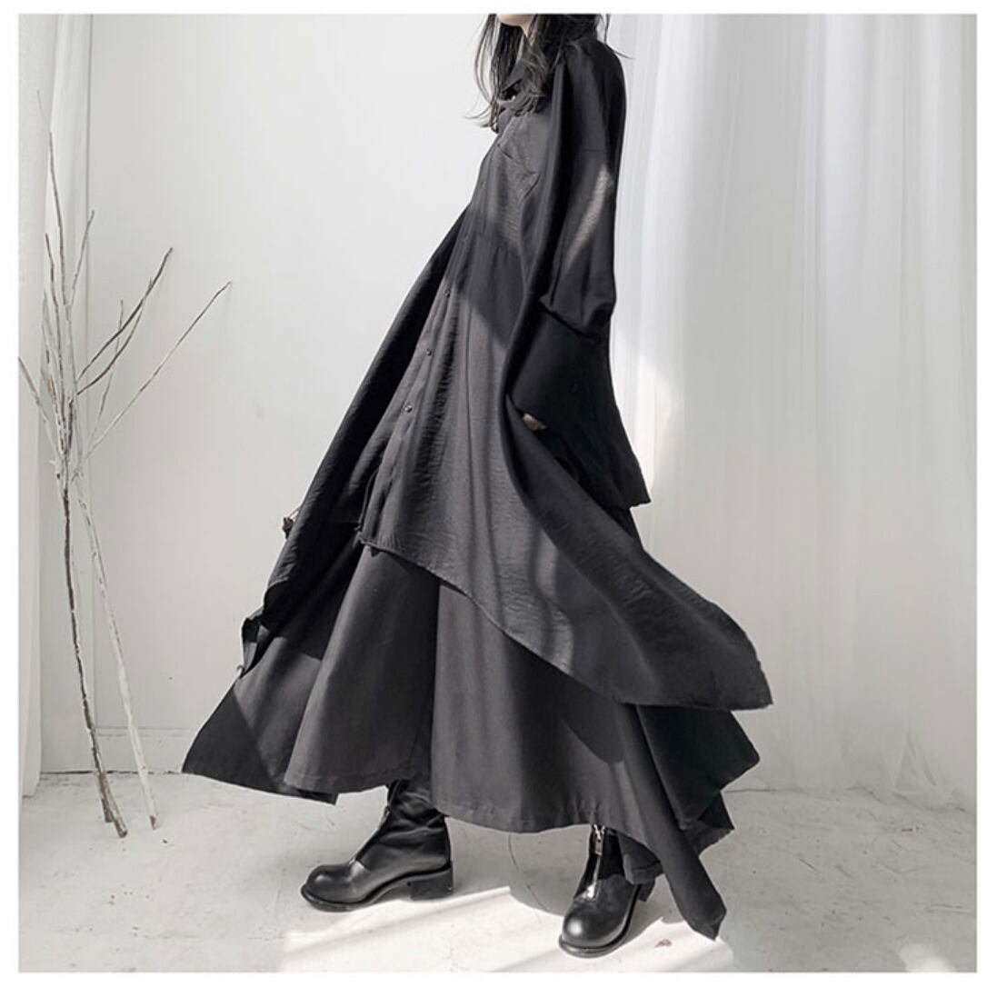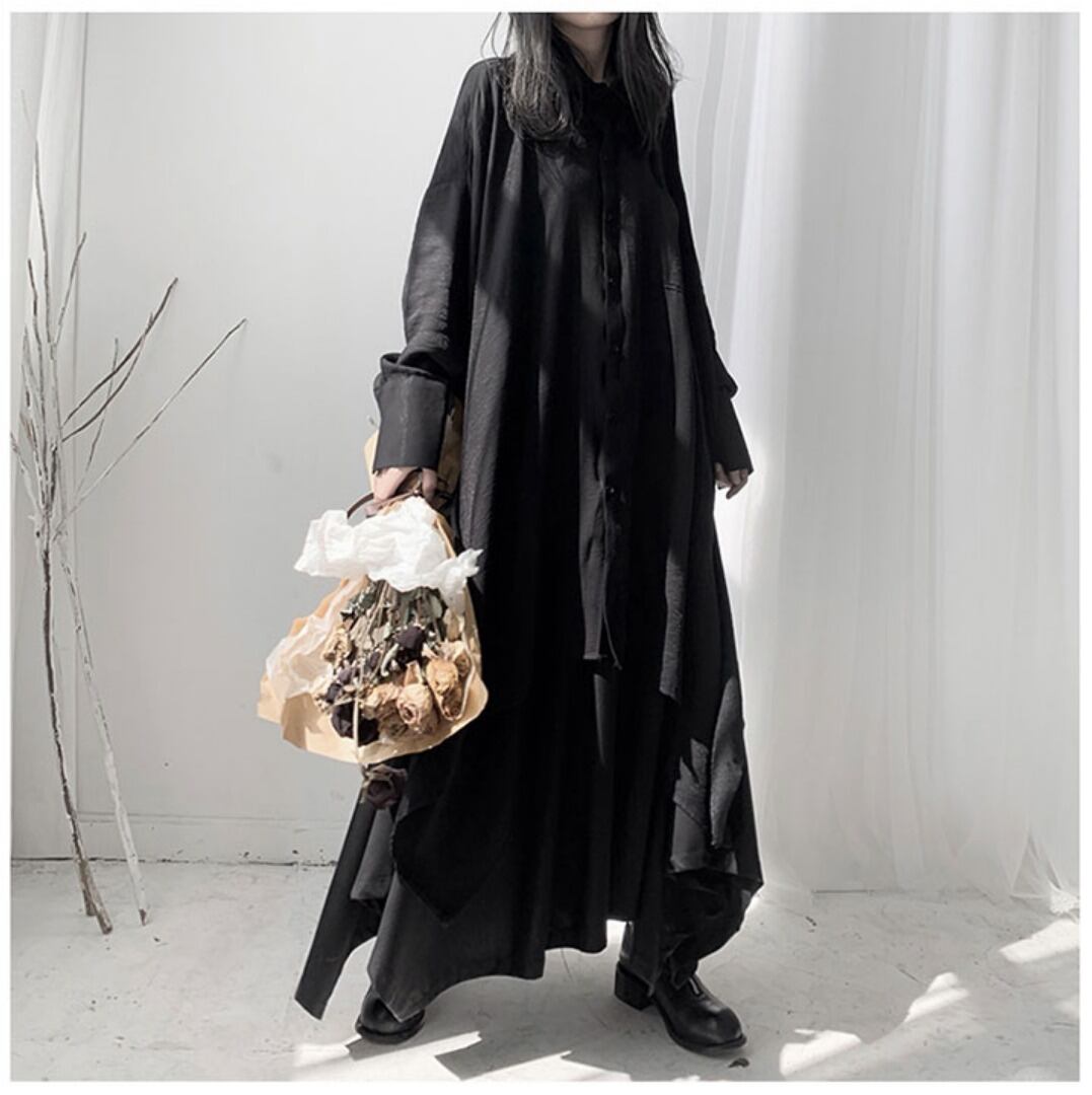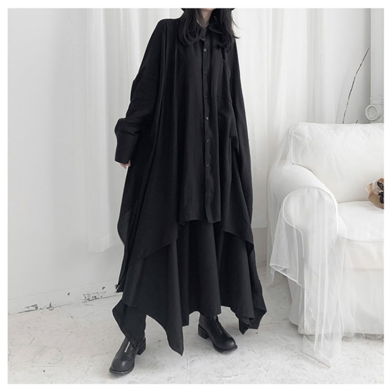 トップス シャツ ブラウス 羽織り 膝丈 ひざ丈 ロング ロング丈 マキシ マキシ丈 袖あり 長袖 ボリューム袖 パフスリーブ 襟付き スタンダードカラー フレア ワイド Aライン フィッシュテール 前開き ボタン ポリエステル かわいい 大人可愛い シンプル カジュアル 大人 上品 おしゃれ お洒落 レトロ 大人女子 こなれ感 ラフ キュート ルーズ クール モード系 エレガント モダン 主役級 存在感 フェミニン 無地 春 秋 冬 着回し 普段使い 重ね着 楽ちん プレゼント ギフト ゆったり ゆる