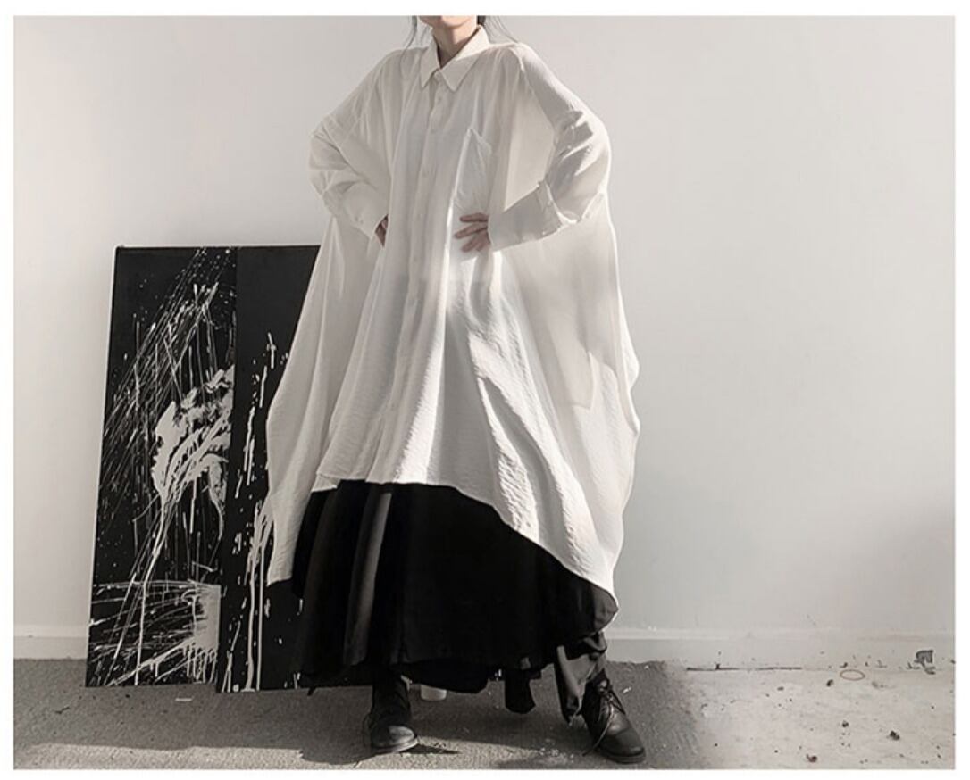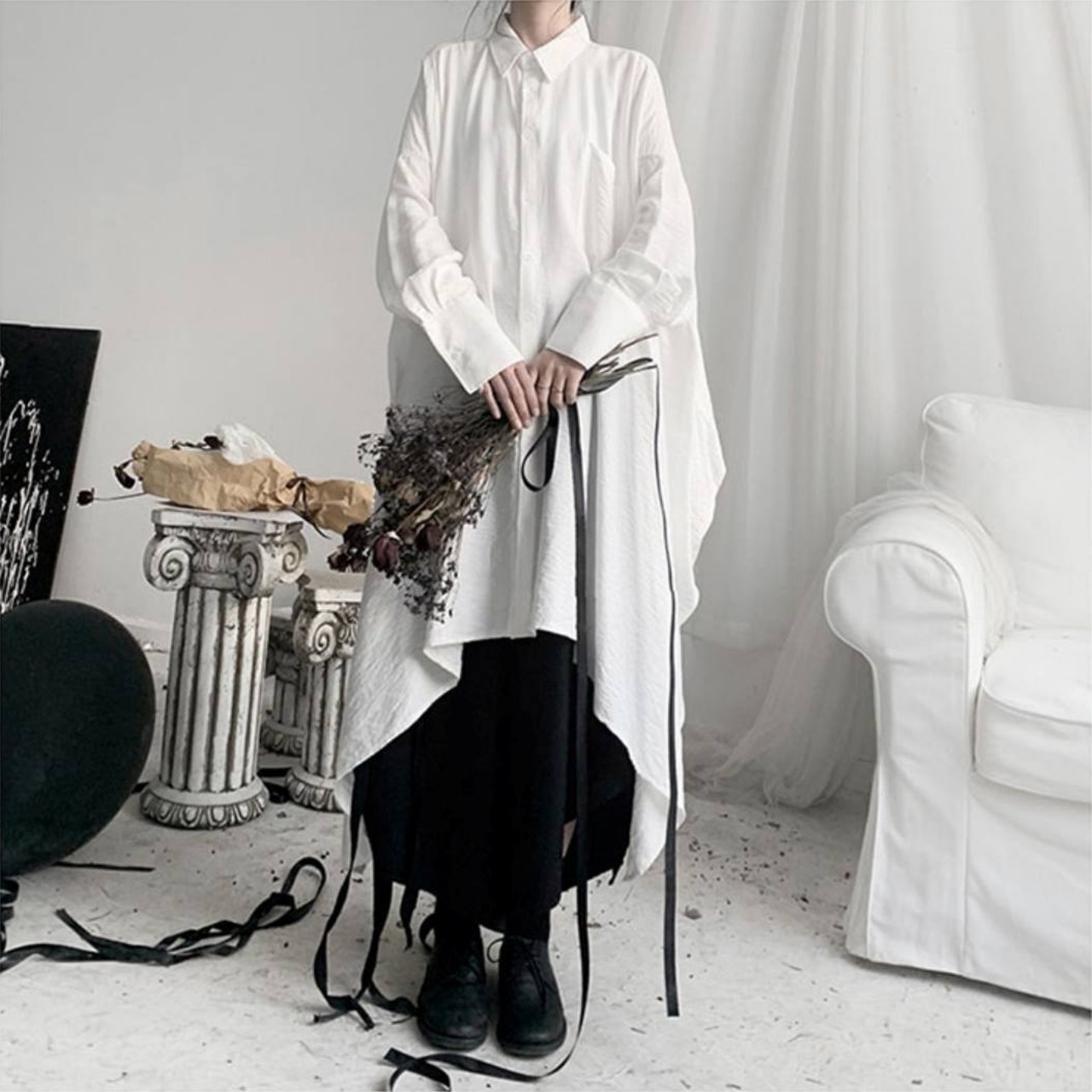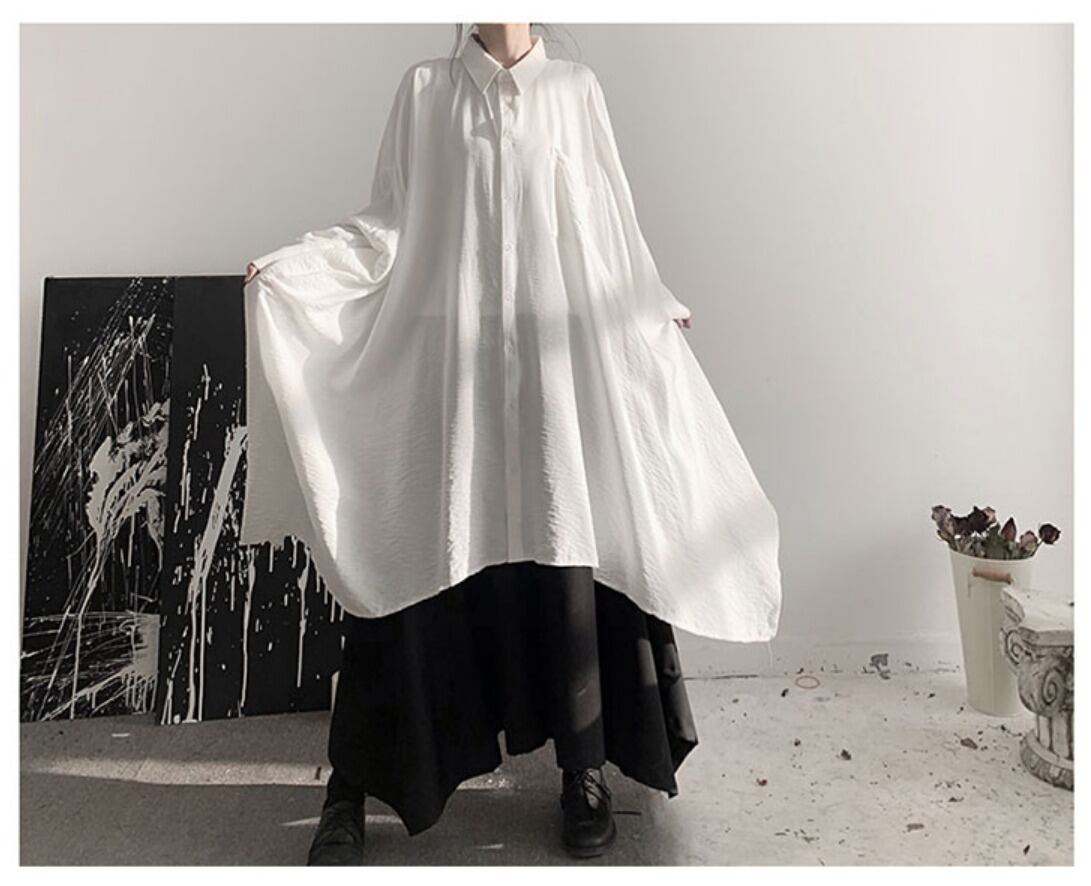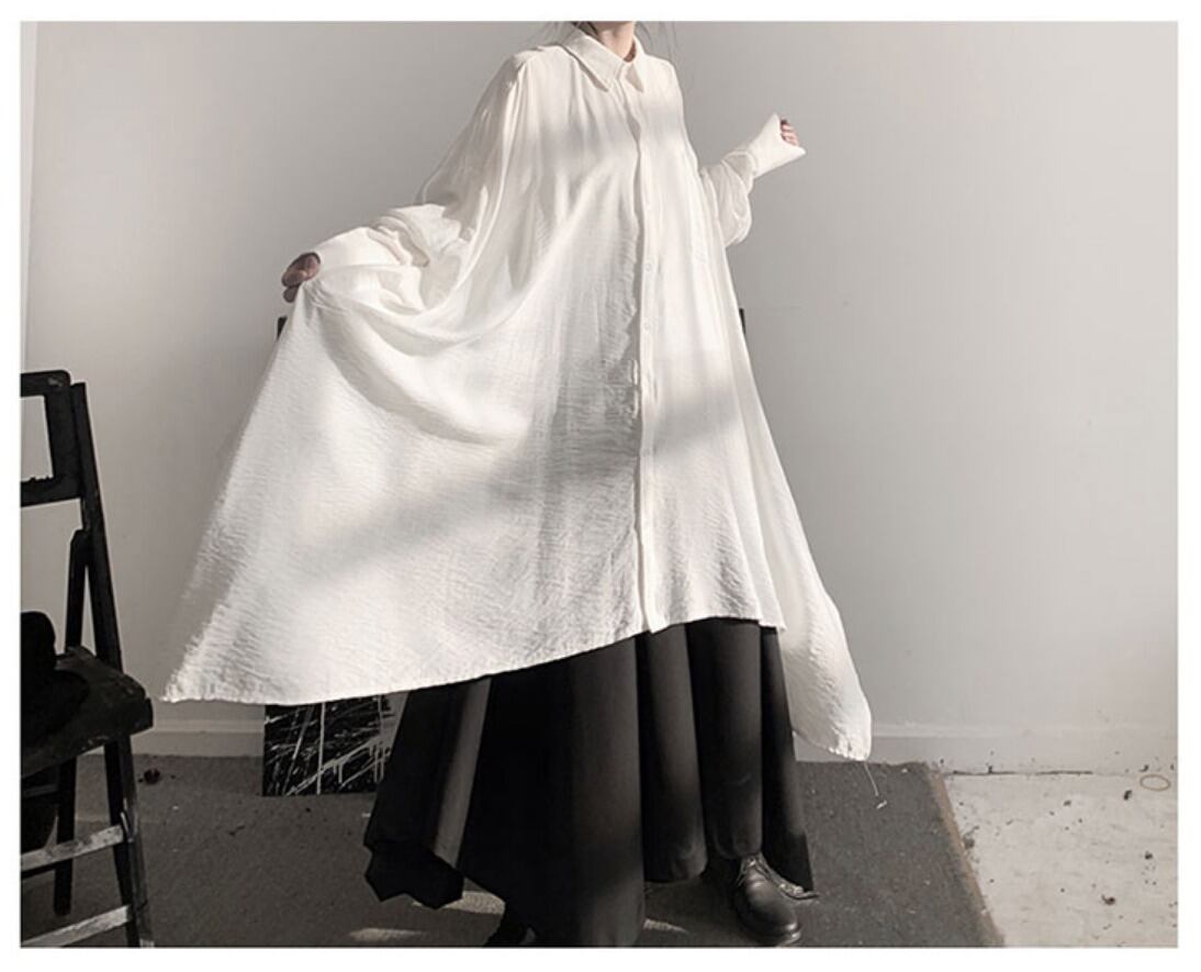 トップス シャツ ブラウス 羽織り 膝丈 ひざ丈 ロング ロング丈 マキシ マキシ丈 袖あり 長袖 ボリューム袖 パフスリーブ 襟付き スタンダードカラー フレア ワイド Aライン フィッシュテール 前開き ボタン ポリエステル かわいい 大人可愛い シンプル カジュアル 大人 上品 おしゃれ お洒落 レトロ 大人女子 こなれ感 ラフ キュート ルーズ クール モード系 エレガント モダン 主役級 存在感 フェミニン 無地 春 秋 冬 着回し 普段使い 重ね着 楽ちん プレゼント ギフト ゆったり ゆる