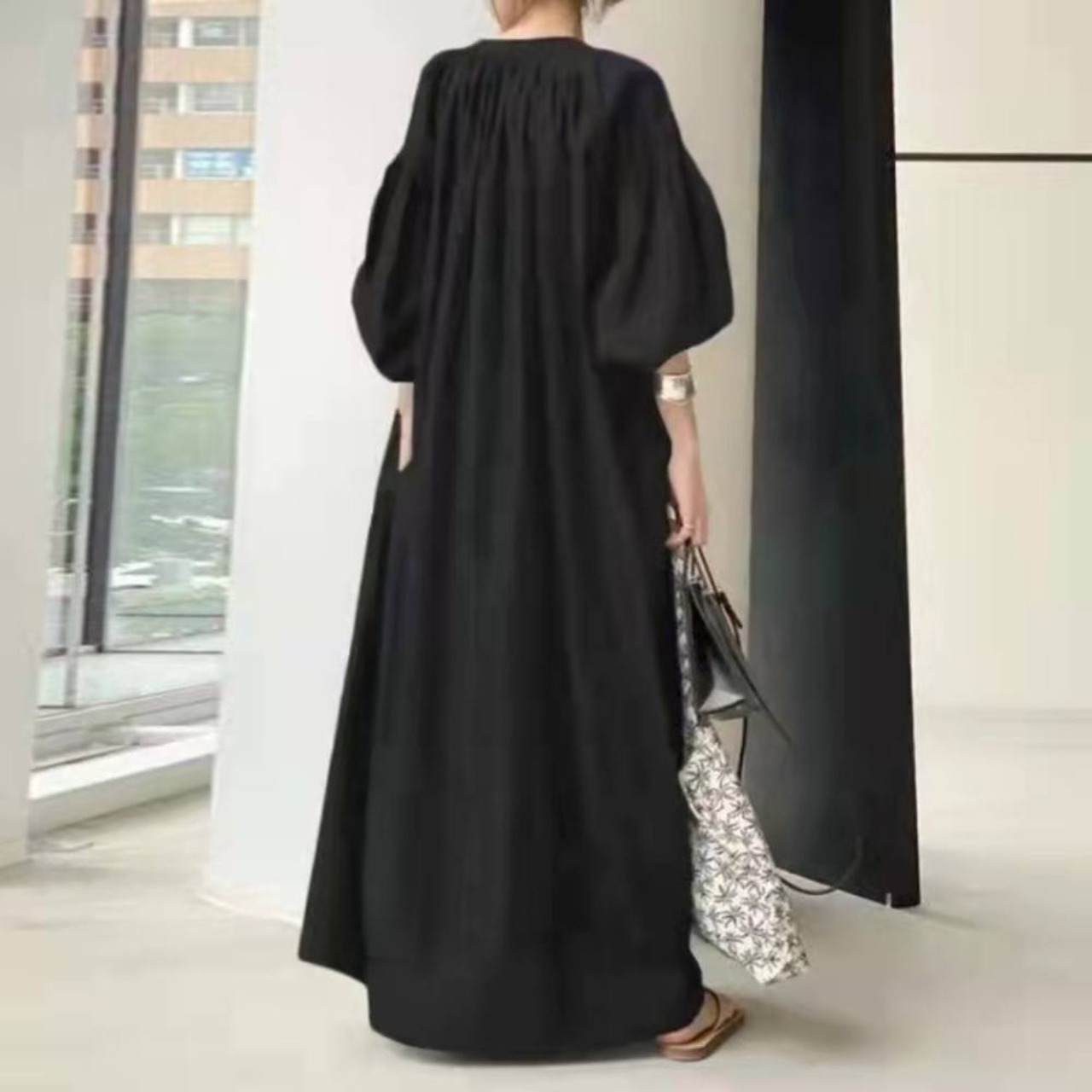 ボリューム感のあるバルーンスリーブが大人可愛い、マキシ丈ワンピースです。
