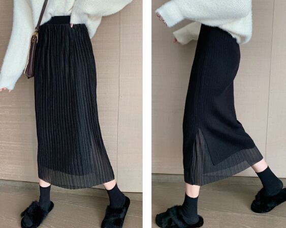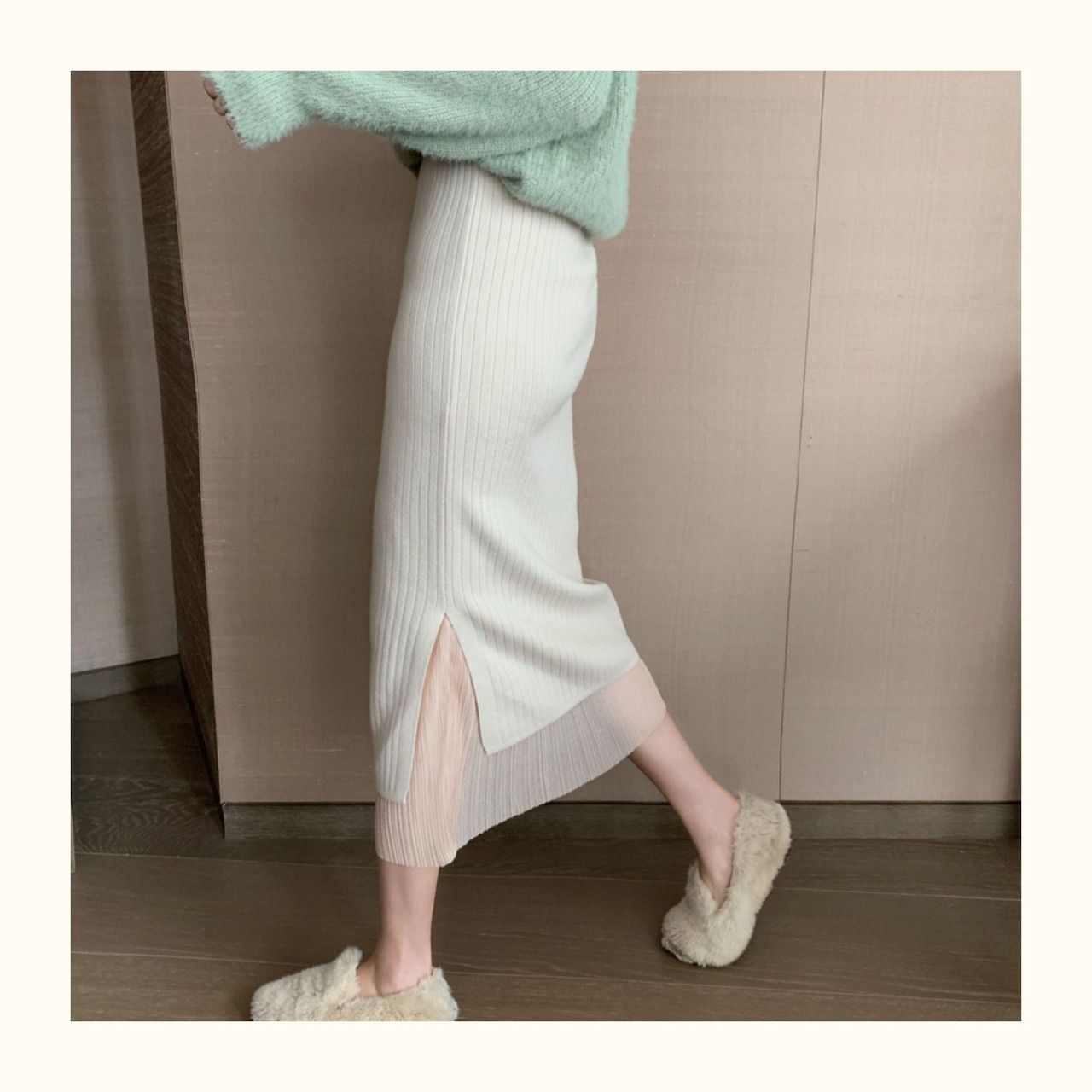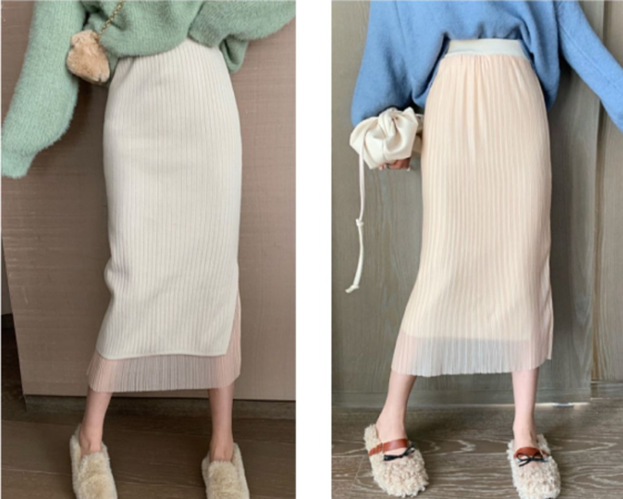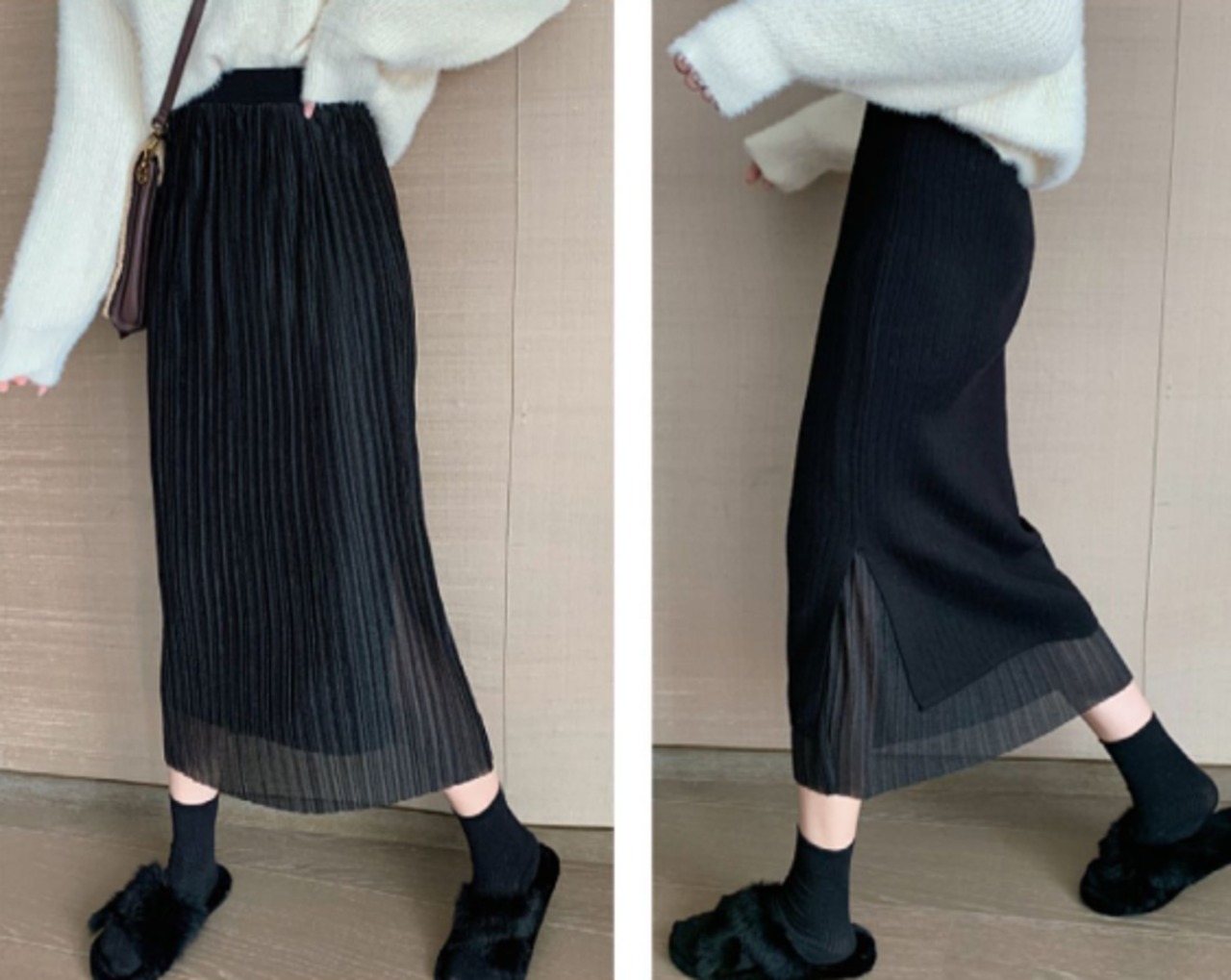 スカート ニットスカート 膝下 ミモレ丈 Iライン 切り替えデザイン プリーツ サイドスリット 切り替えデザイン 透け感 異素材MIX 大人可愛い シンプル 大人 上品 おしゃれ 大人女子 こなれ感 個性的 主役級 無地 秋 冬 10代 20代 30代 40代 オフィス 通勤 デート お出かけ 女子会 お泊まり 休日 イベント 普段使い 楽ちん 美脚 S M L 白 ホワイト 黒 ブラック