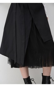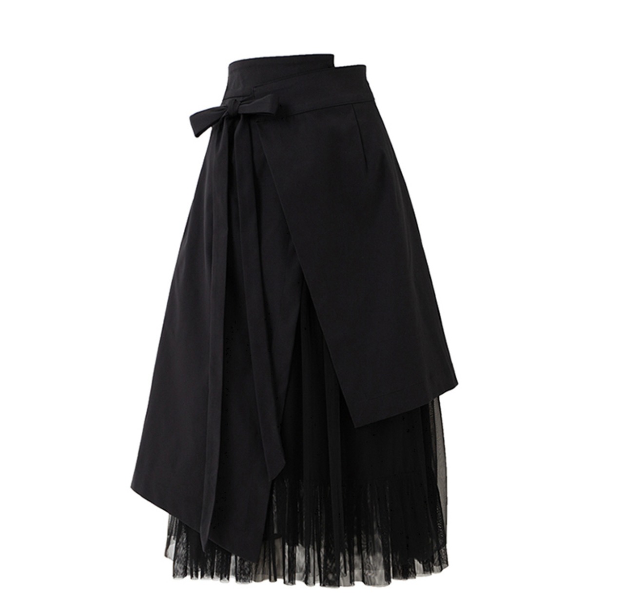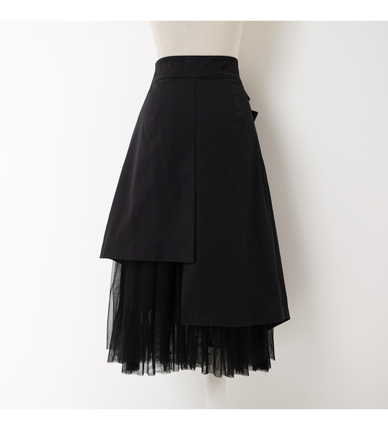 スカート チュールスカート 膝下 ワイド アシンメトリー 切り替えデザイン チュール リボン ウエストリボン 切り替えデザイン ポリエステル 異素材MIX おしゃれ お洒落 かっこいい 個性的 クール 主役級 存在感 無地 春 夏 秋 10代 20代 学生 お出かけ 休日 パーティー イベント 韓国 S M L 黒 ブラック
