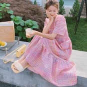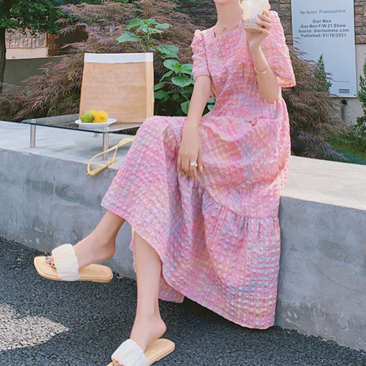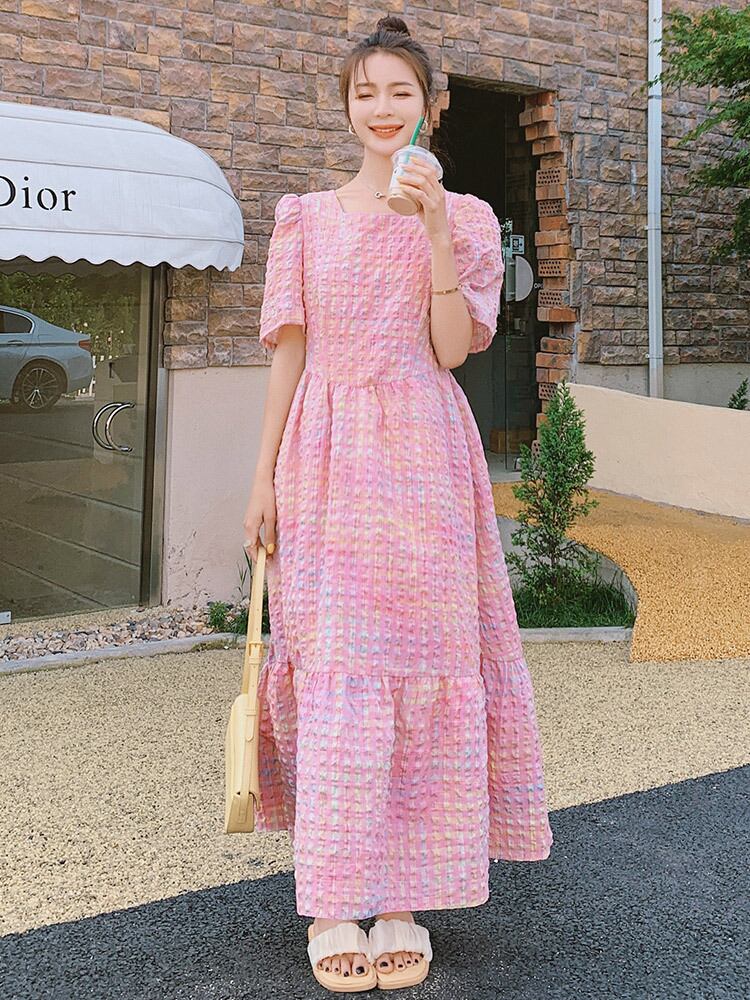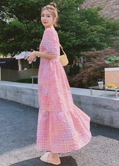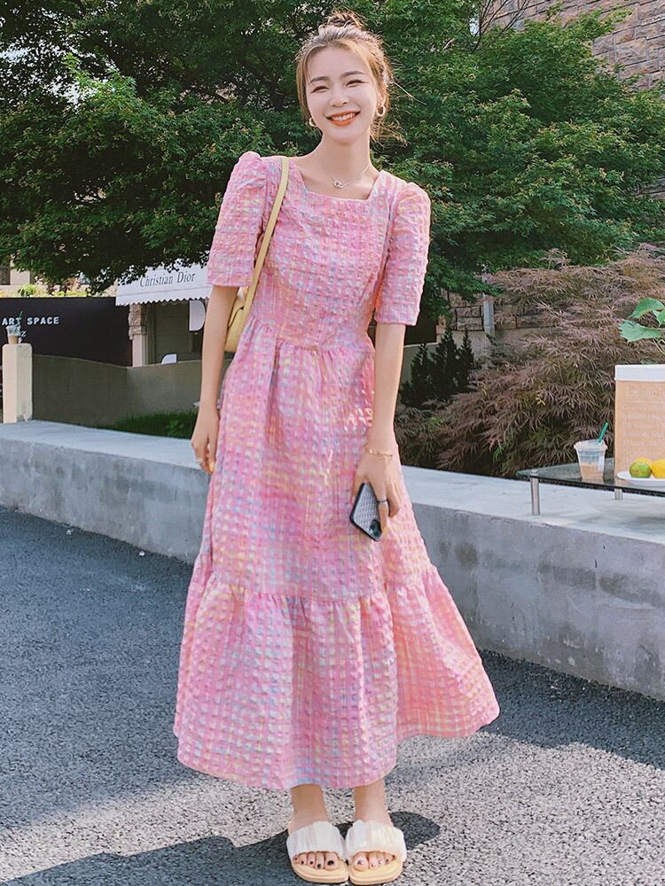 ワンピース フレアワンピース ティアードワンピース ロング ロング丈 マキシ マキシ丈 9分丈 アンクル丈 袖あり 半袖 スクエアネック セミフレア マーメイド 大人可愛い カジュアル おしゃれ お洒落 こなれ感 ラフ ラブリー キュート ガーリー 主役級 存在感 とろみ感 抜け感 春 夏 10代 20代 30代 学生 お出かけ 休日 リゾート 旅行 海 プール モテ 体系カバー 美脚 脚長 XS S M L XL 2XL ピンク