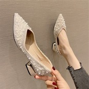 たっぷりついたパールやビジューが華やかなポインテッドトゥパンプスです。