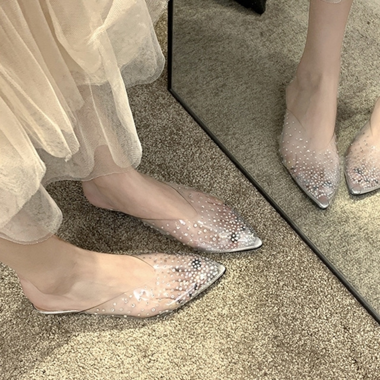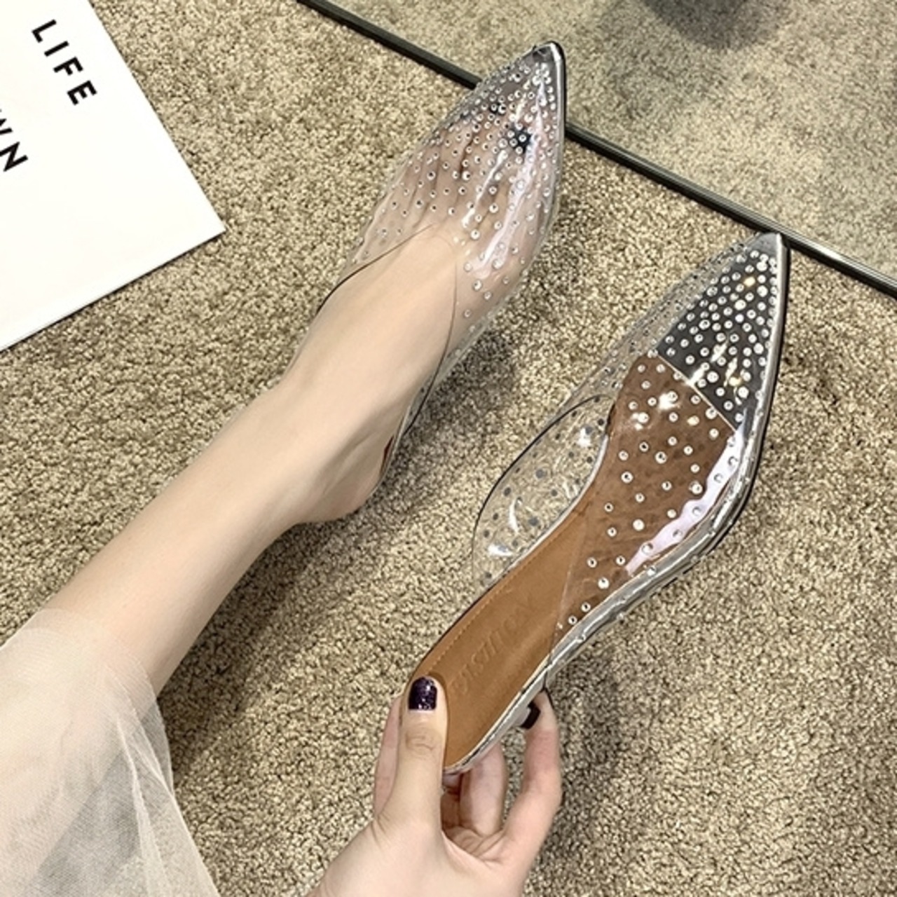 シューズ サンダル ミュール クリアカラー ビジュー ドット柄 シースルー ポインテッドトゥ ローヒール PU エレガント 大人可愛い 大人女子 おしゃれ お洒落 歩きやすい 疲れにくい 美脚 きれいめ カジュアル お出かけ デイリー デート リゾート ビーチ 夏 レディースシューズ
