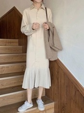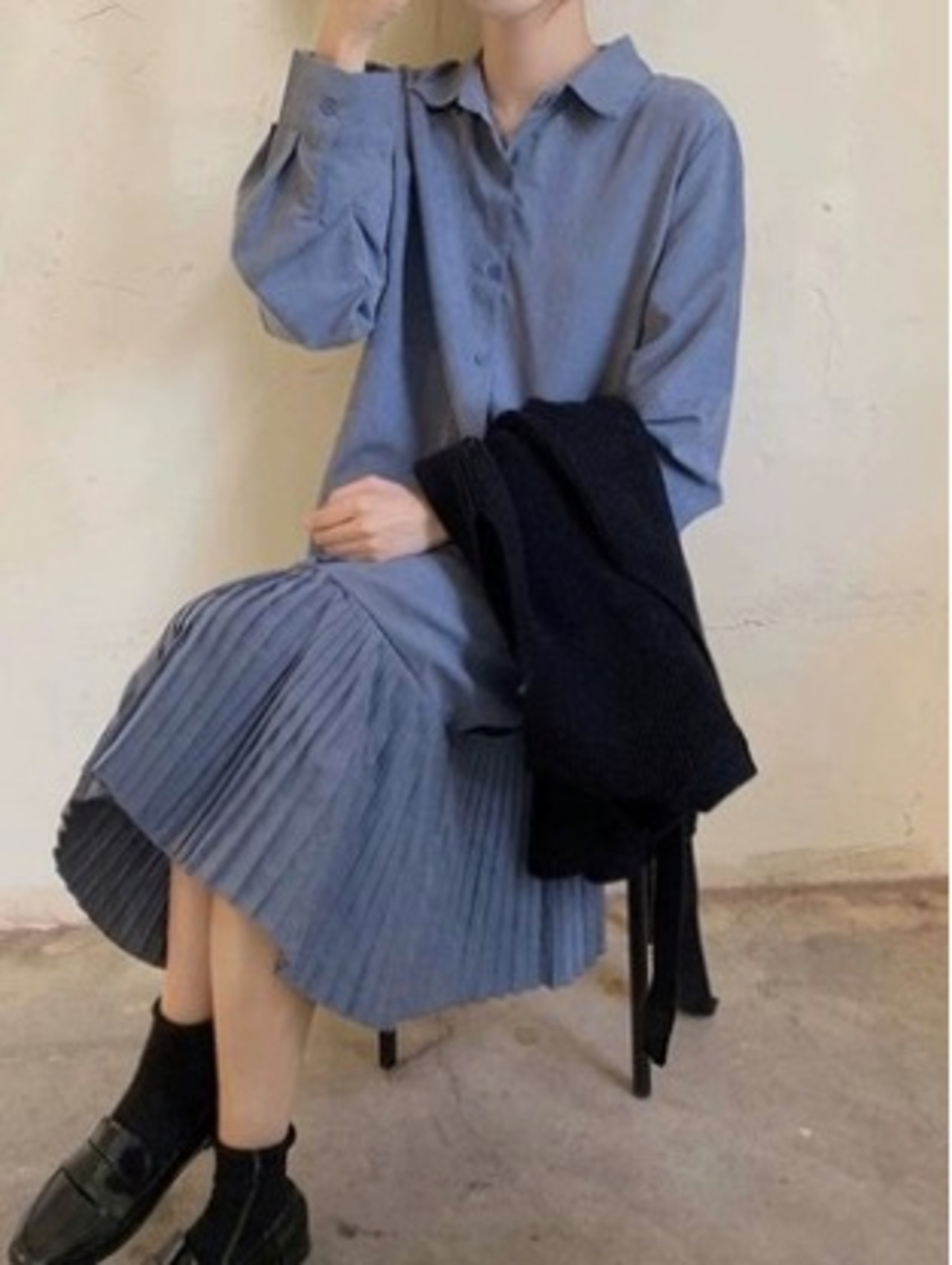 シャツワンピースの裾がプリーツになっていて1枚で着ても主役級。