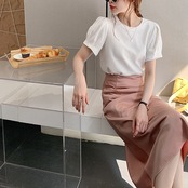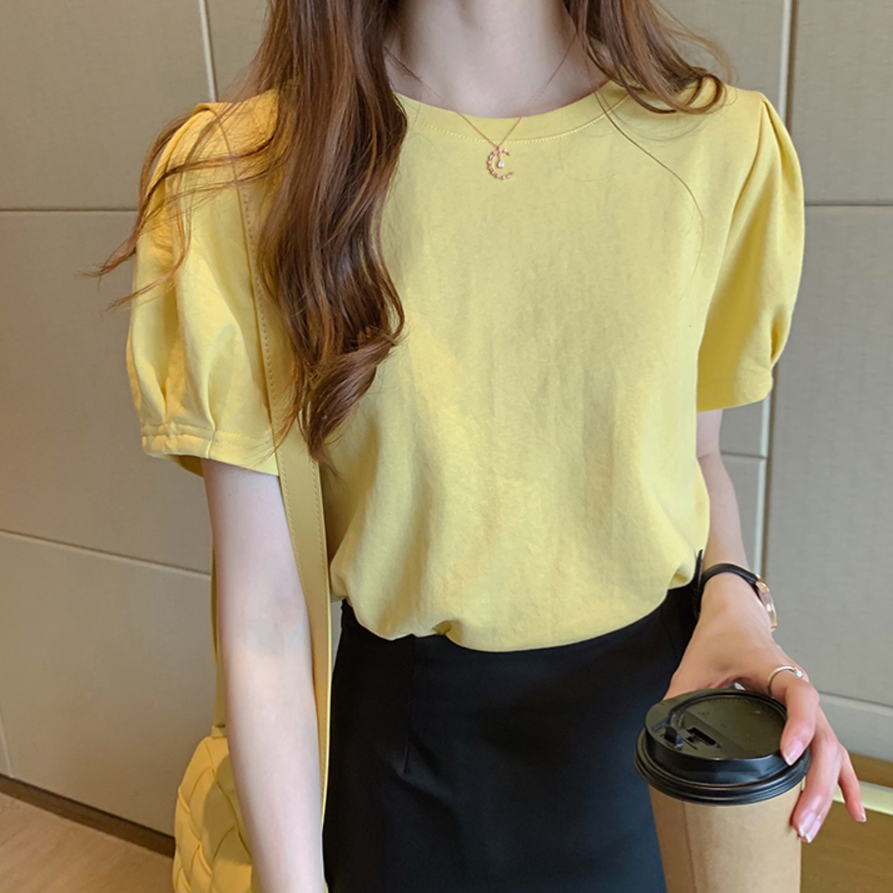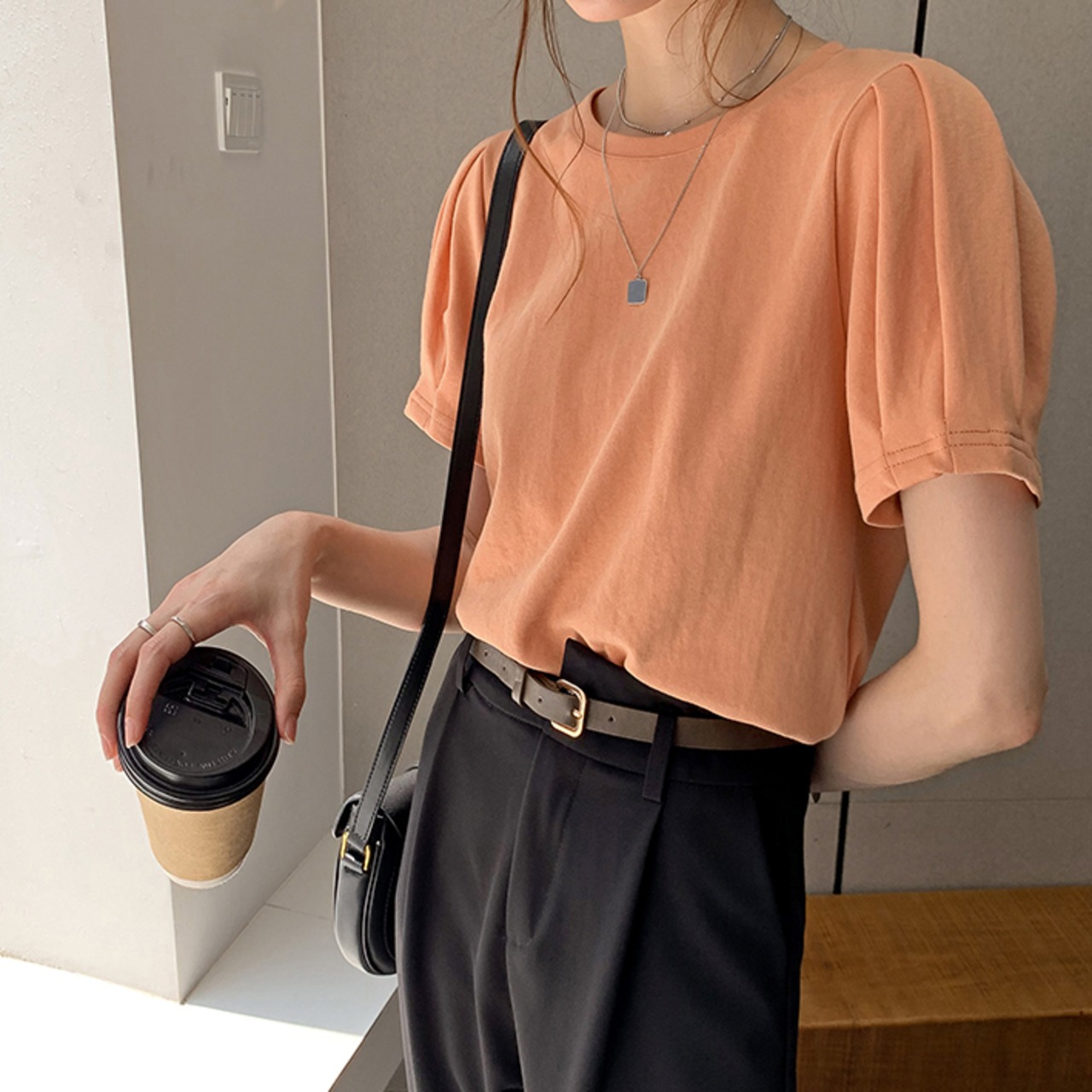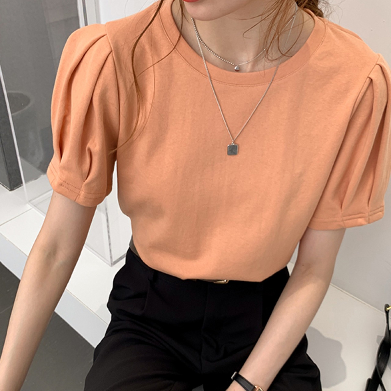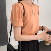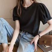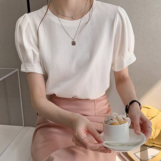 Tシャツ パフスリーブ 半袖 ラウンドネック 無地 かわいい 大人可愛い きれいめ シンプル カジュアル 大人 上品 おしゃれ かっこいい 大人カジュアル 大人女子 こなれ感 キュート フェミニン シック ナチュラル ベーシック タック 春 秋 レディース オフィス ビジネス OL 通勤 学生 通学 デート お出かけ 公園デビュー 女子会 お泊まり イベント リモート会議 着回し 普段使い 重ね着 デイリー スタイルアップ コーデ きちんと感 定番 日常使い 休日 くすみカラー ニュアンスカラー