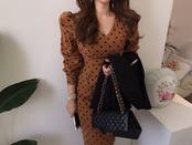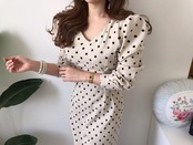 ワンピース ペンシルスカート コクーンスカート タイトスカート ひざ丈 膝下 袖あり ボリューム袖 パフスリーブ Vネック スリム タイト 細身 大人可愛い きれいめ 大人 上品 おしゃれ お洒落 大人女子 ラブリー キュート ガーリー セクシー エレガント 主役級 存在感 ドット柄 水玉 春 秋 冬 2022 2023 10代 20代 30代 40代 50代 60代 レディース 女性用 デート 女子会 休日 パーティー イベント ホテル ガーデン レストラン S M L 白 ホワイト 茶色 ブラウン