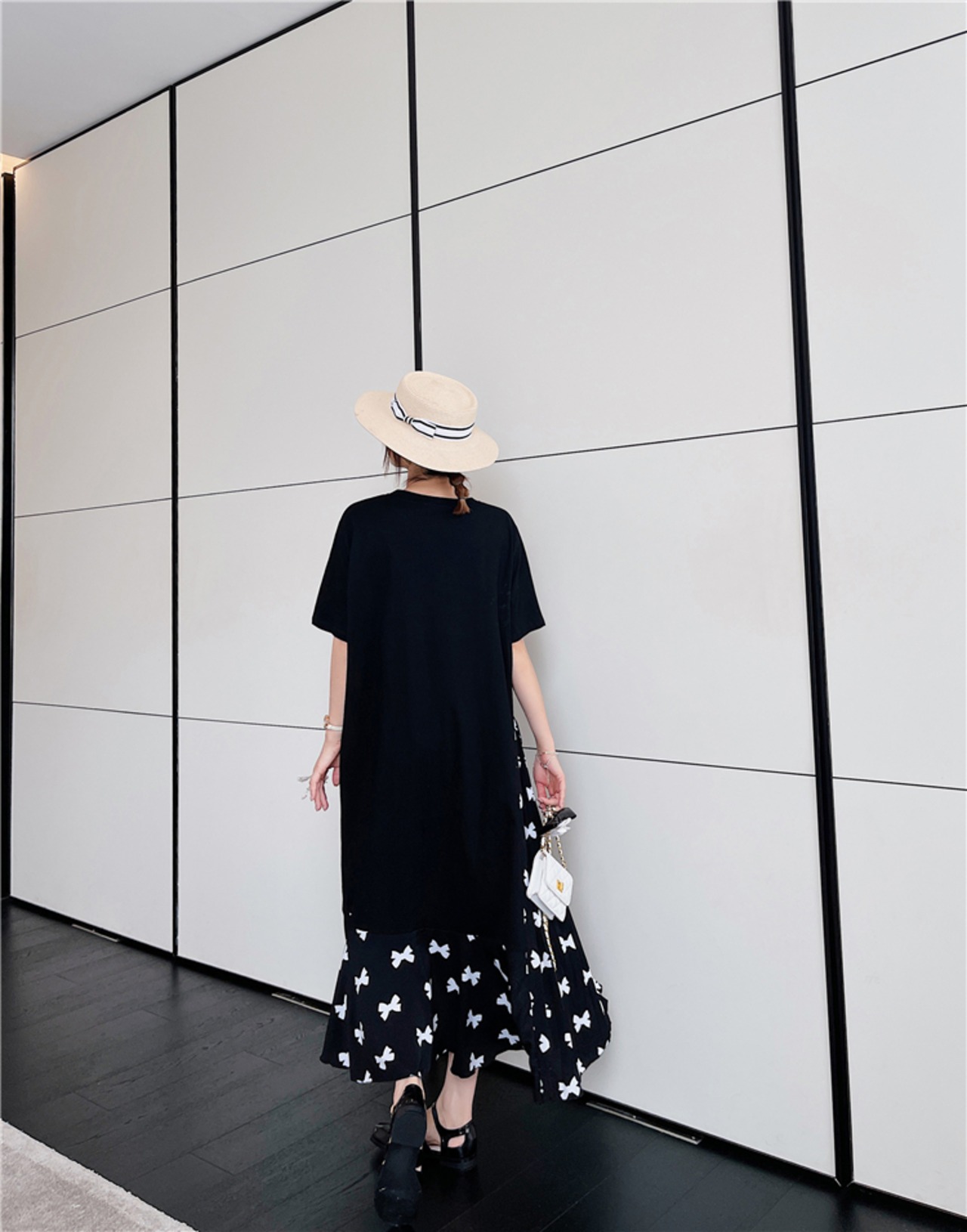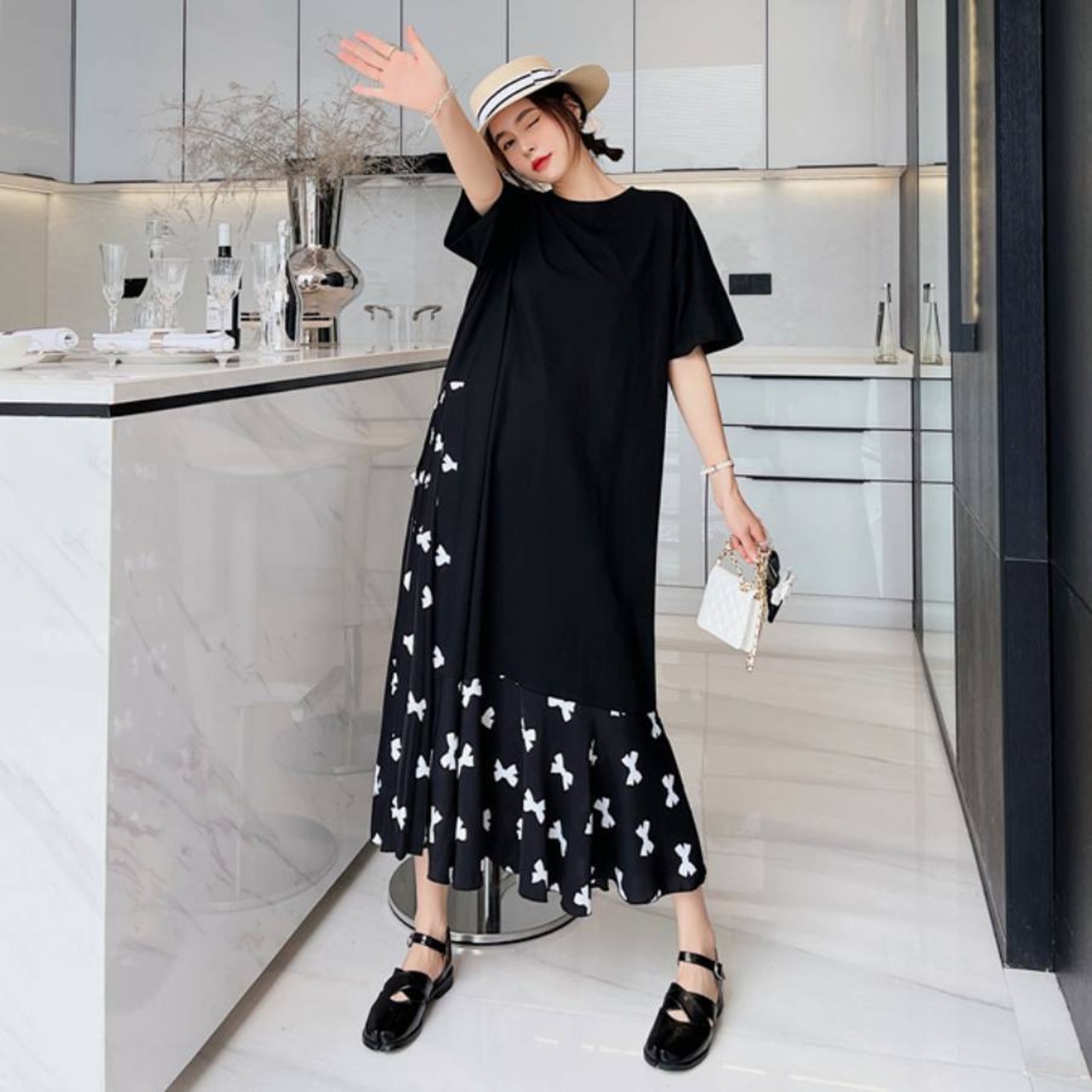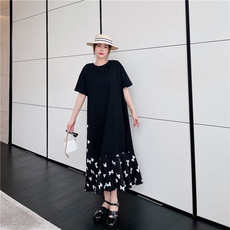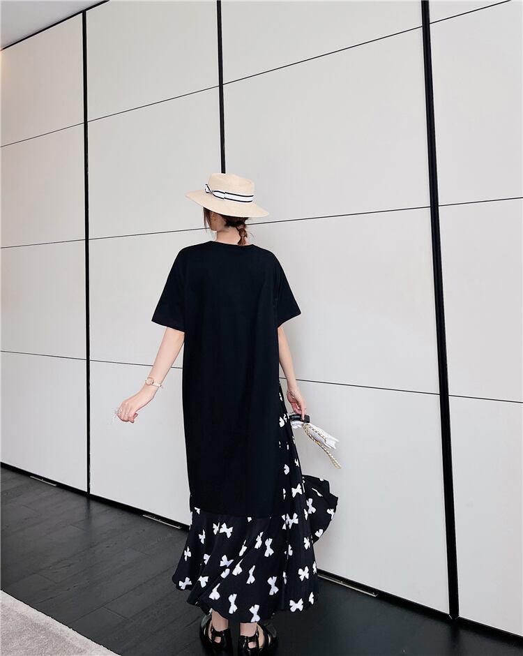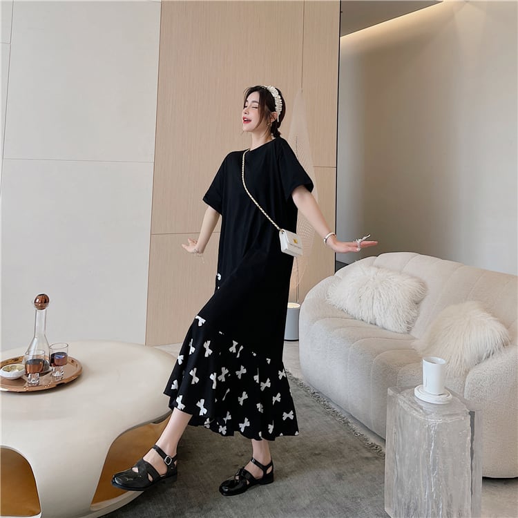 サイドスリットから覗くリボン柄のシフォンスカートが大人可愛いTシャツワンピースです。