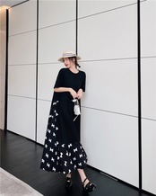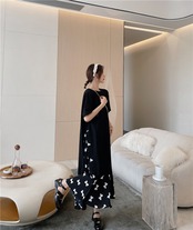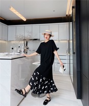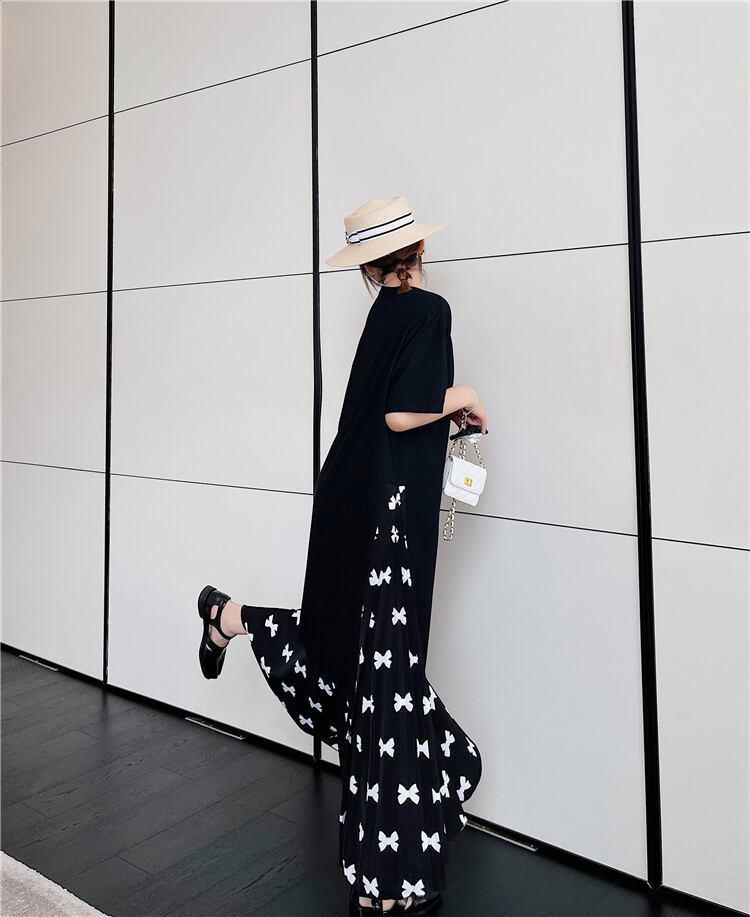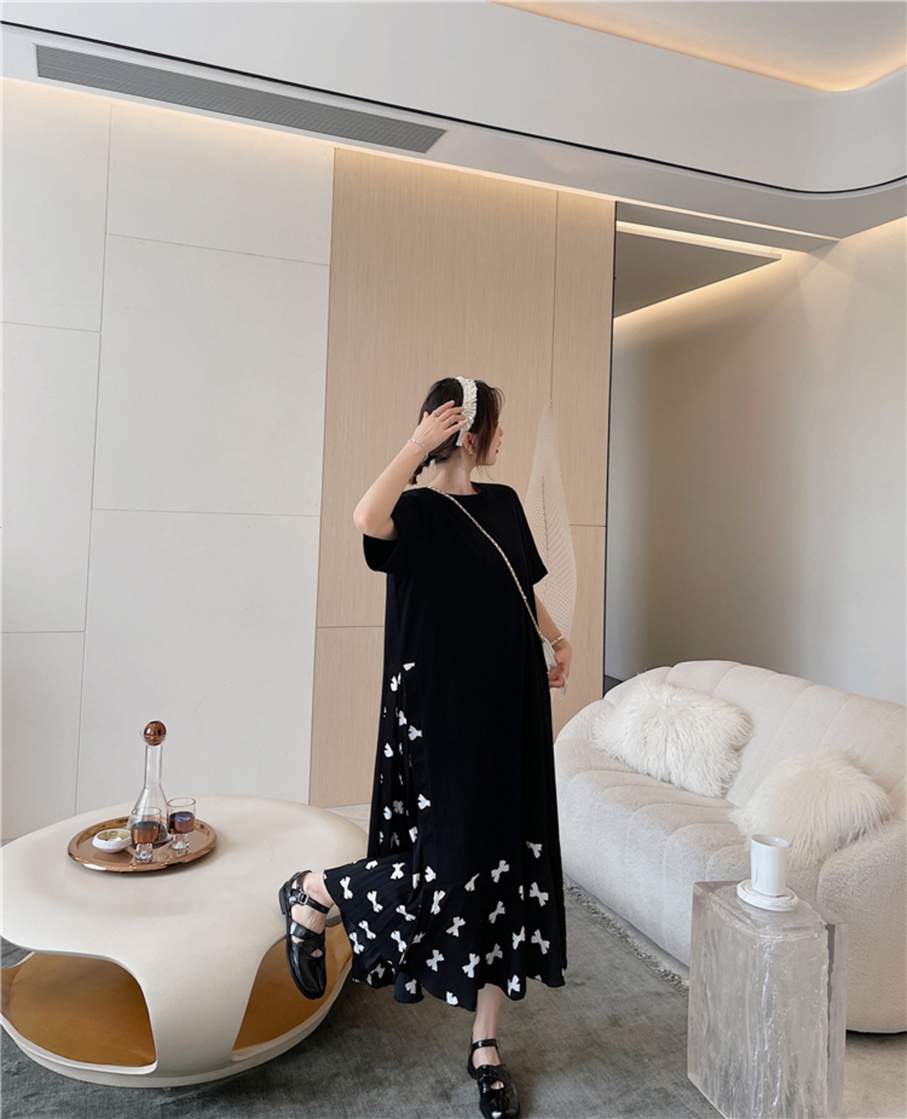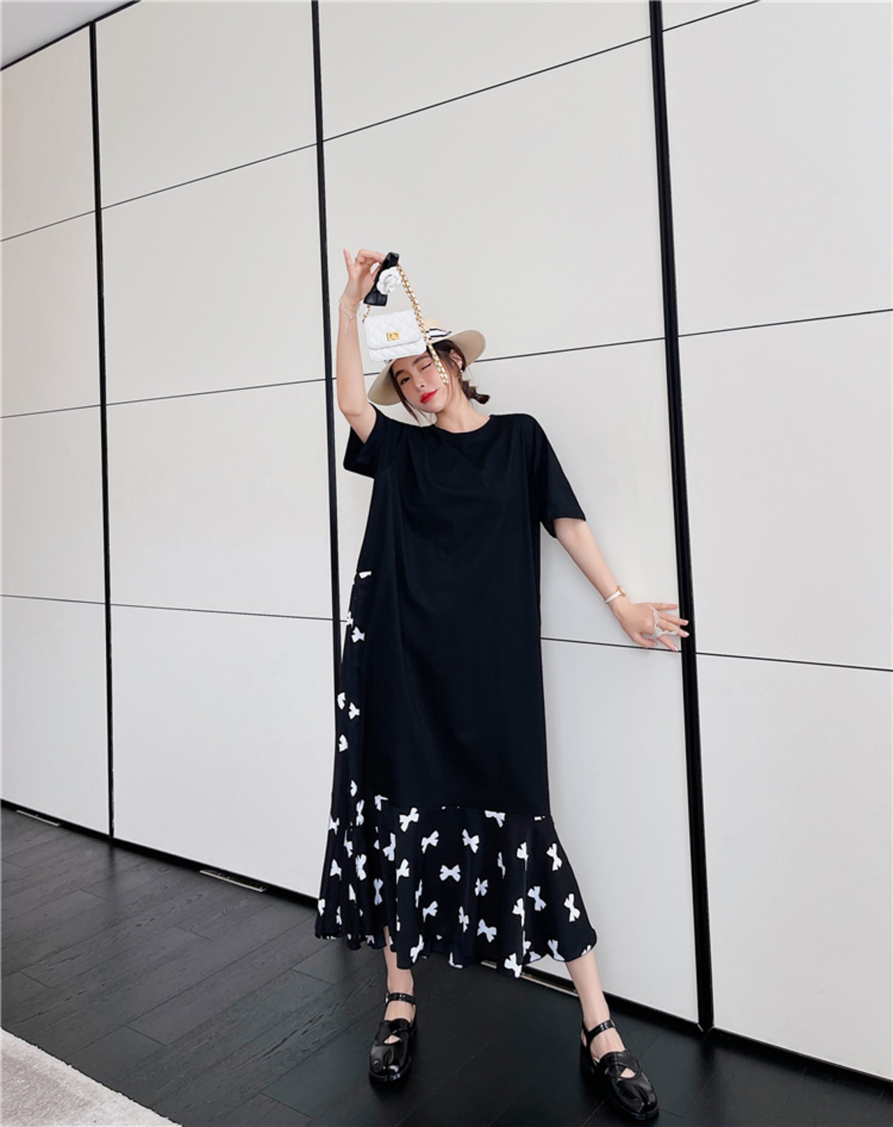 サイドスリットから覗くリボン柄のシフォンスカートが大人可愛いTシャツワンピースです。