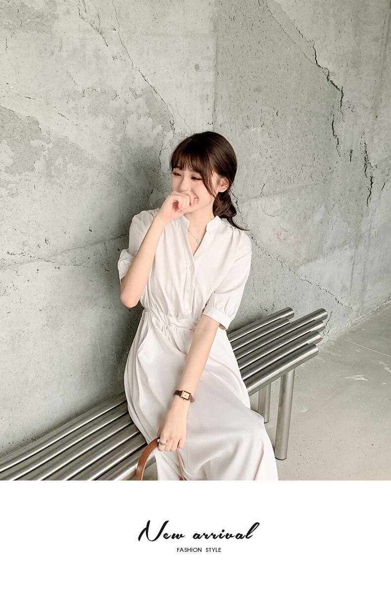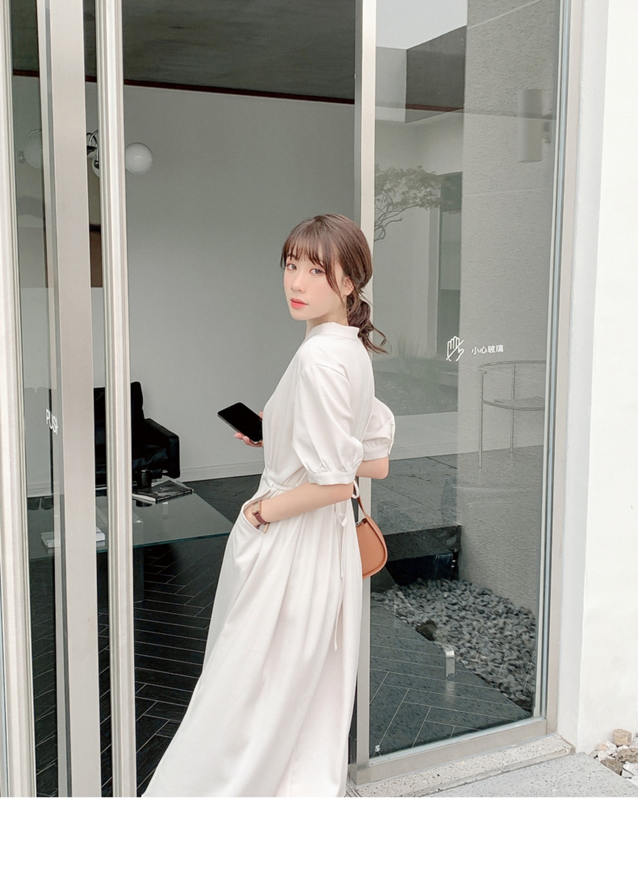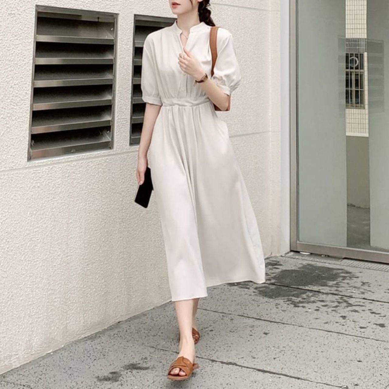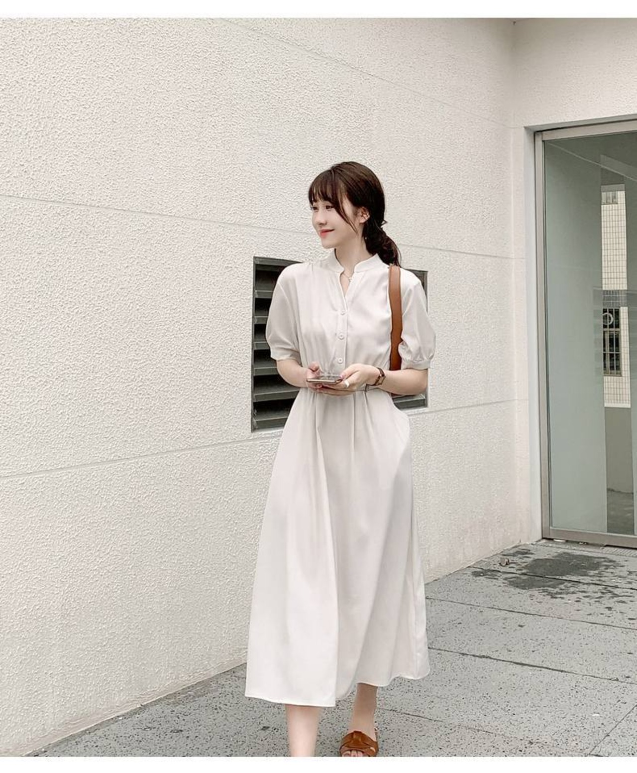 ワンピース シャツワンピース フレアワンピース ミモレ ミモレ丈 ロング ロング丈 袖あり 半袖 パフスリーブ Vネック 襟付き スタンドカラー 立ち襟 フレア リボン ウエストマーク バックリボン ポケット ハイウエスト ポリエステル かわいい 大人可愛い きれいめ シンプル 大人 上品 おしゃれ お洒落 大人女子 こなれ感 キュート エレガント モダン とろみ感 抜け感 フェミニン 無地 春 夏 レディース 女性用 デート お出かけ 休日 着回し 普段使い モテ 美脚 脚長 定番