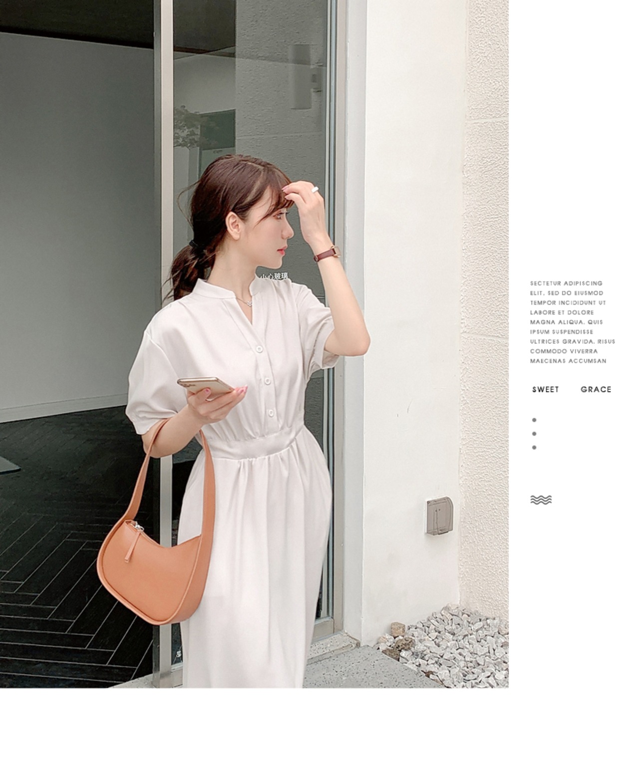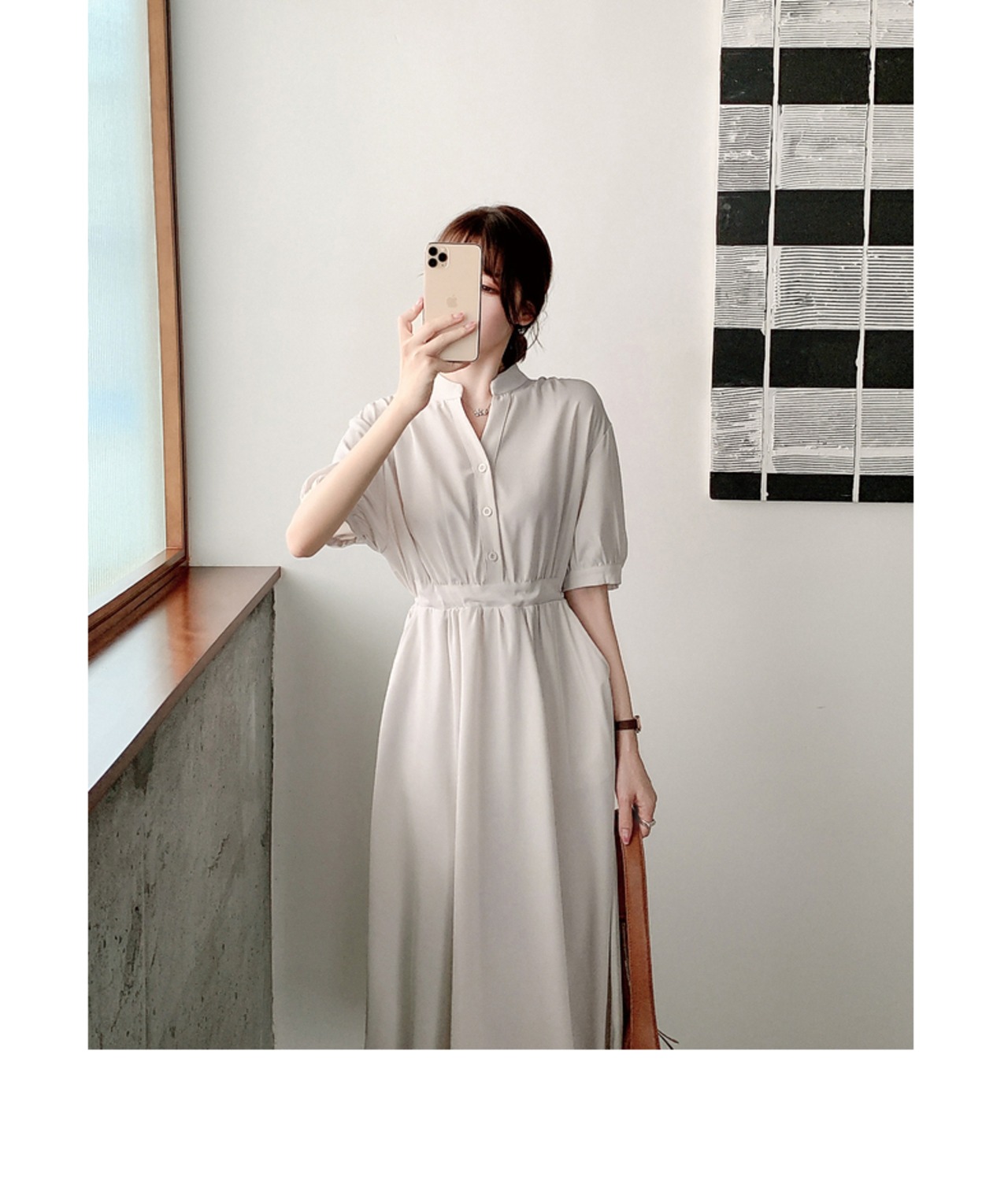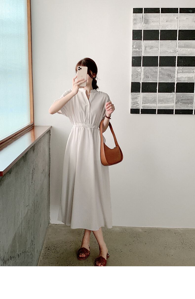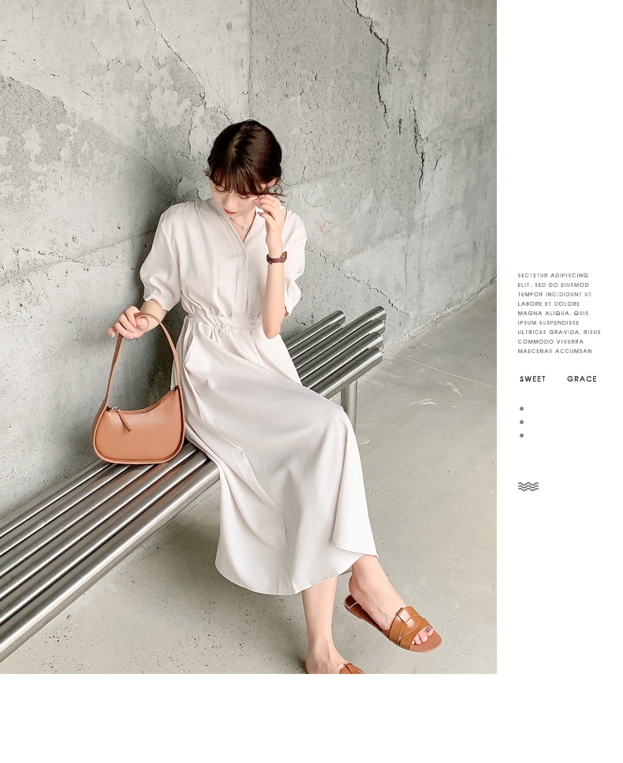 ワンピース シャツワンピース フレアワンピース ミモレ ミモレ丈 ロング ロング丈 袖あり 半袖 パフスリーブ Vネック 襟付き スタンドカラー 立ち襟 フレア リボン ウエストマーク バックリボン ポケット ハイウエスト ポリエステル かわいい 大人可愛い きれいめ シンプル 大人 上品 おしゃれ お洒落 大人女子 こなれ感 キュート エレガント モダン とろみ感 抜け感 フェミニン 無地 春 夏 レディース 女性用 デート お出かけ 休日 着回し 普段使い モテ 美脚 脚長 定番