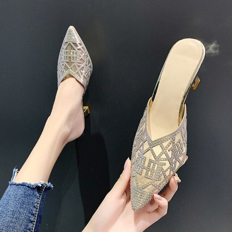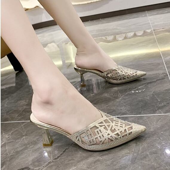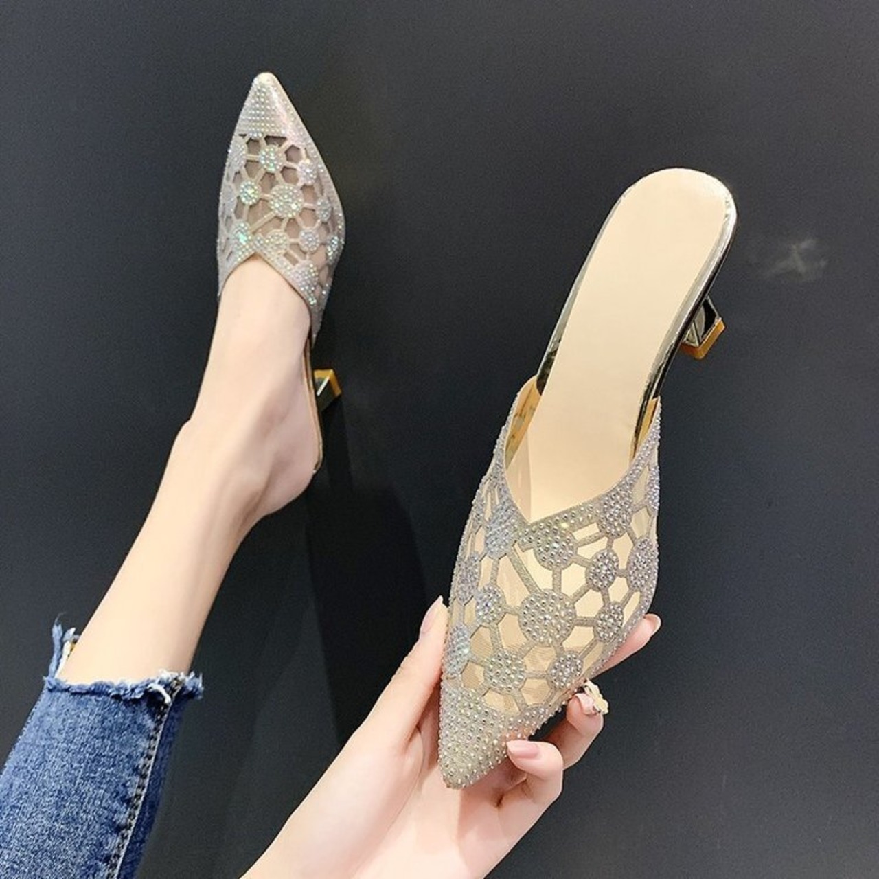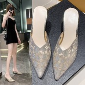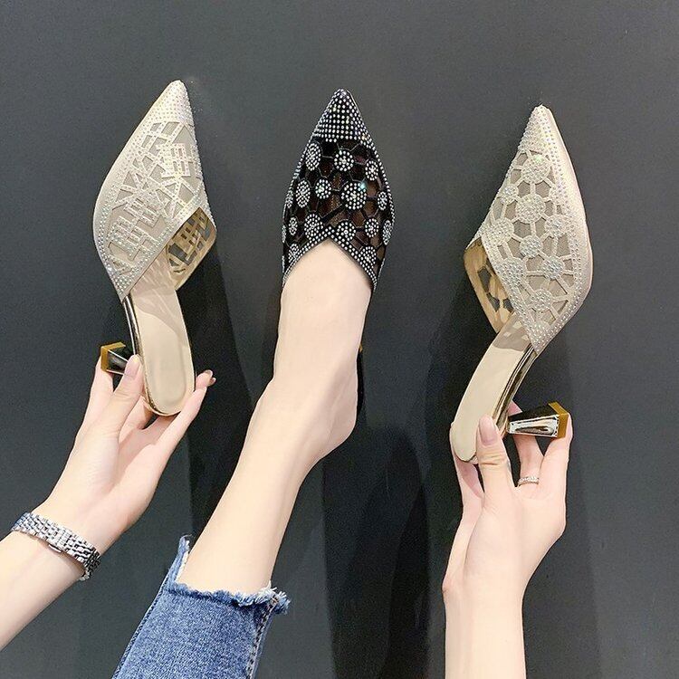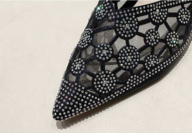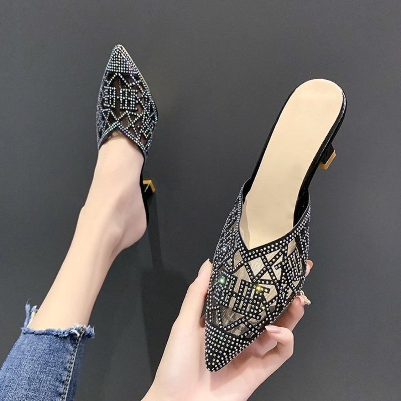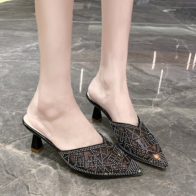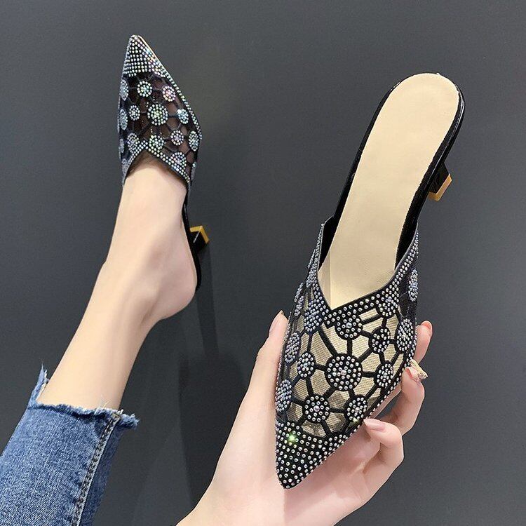 シューズ サンダル ミュール ドット柄 キラキラ ラインストーン ラウンド柄 スクエア柄 ポインテッドトゥ メッシュ ミドルヒール 細ヒール PU 柔らかい 大人可愛い 大人女子 キュート おしゃれ お洒落 エレガント 美脚 上品 きれいめ カジュアル お出かけ 普段使い デート カフェ ランチ 女子会 レジャー レディース