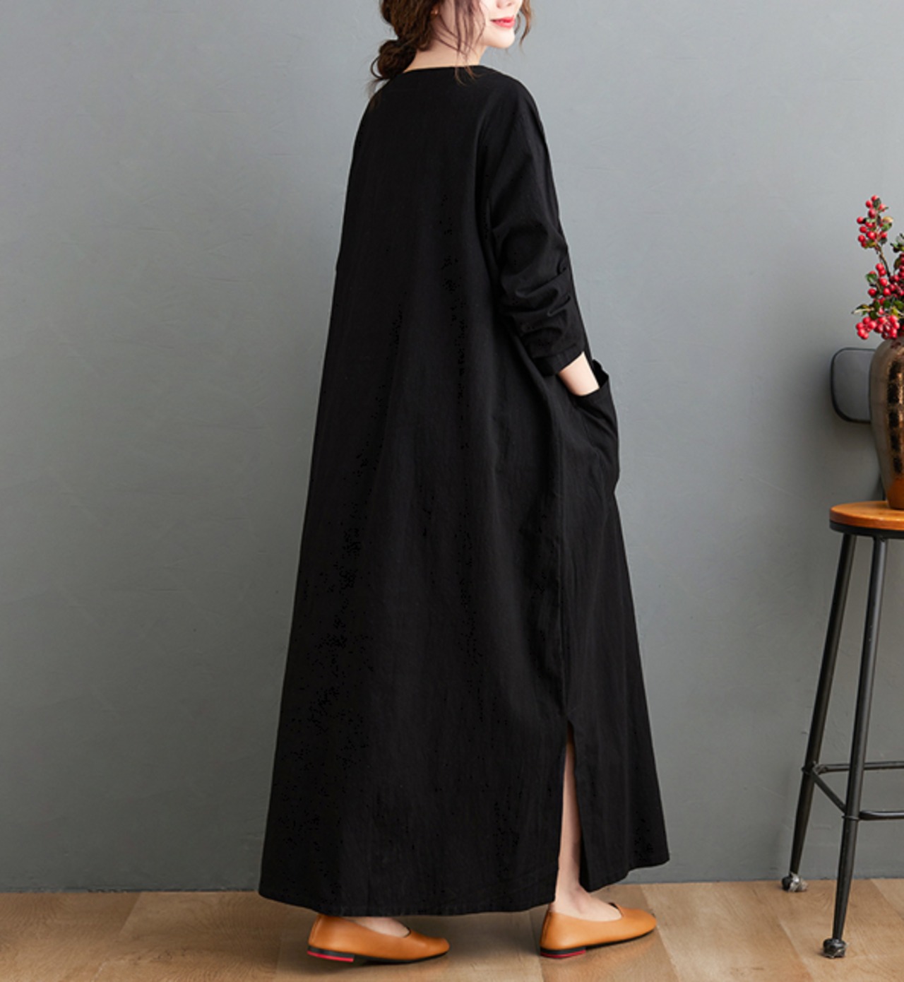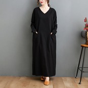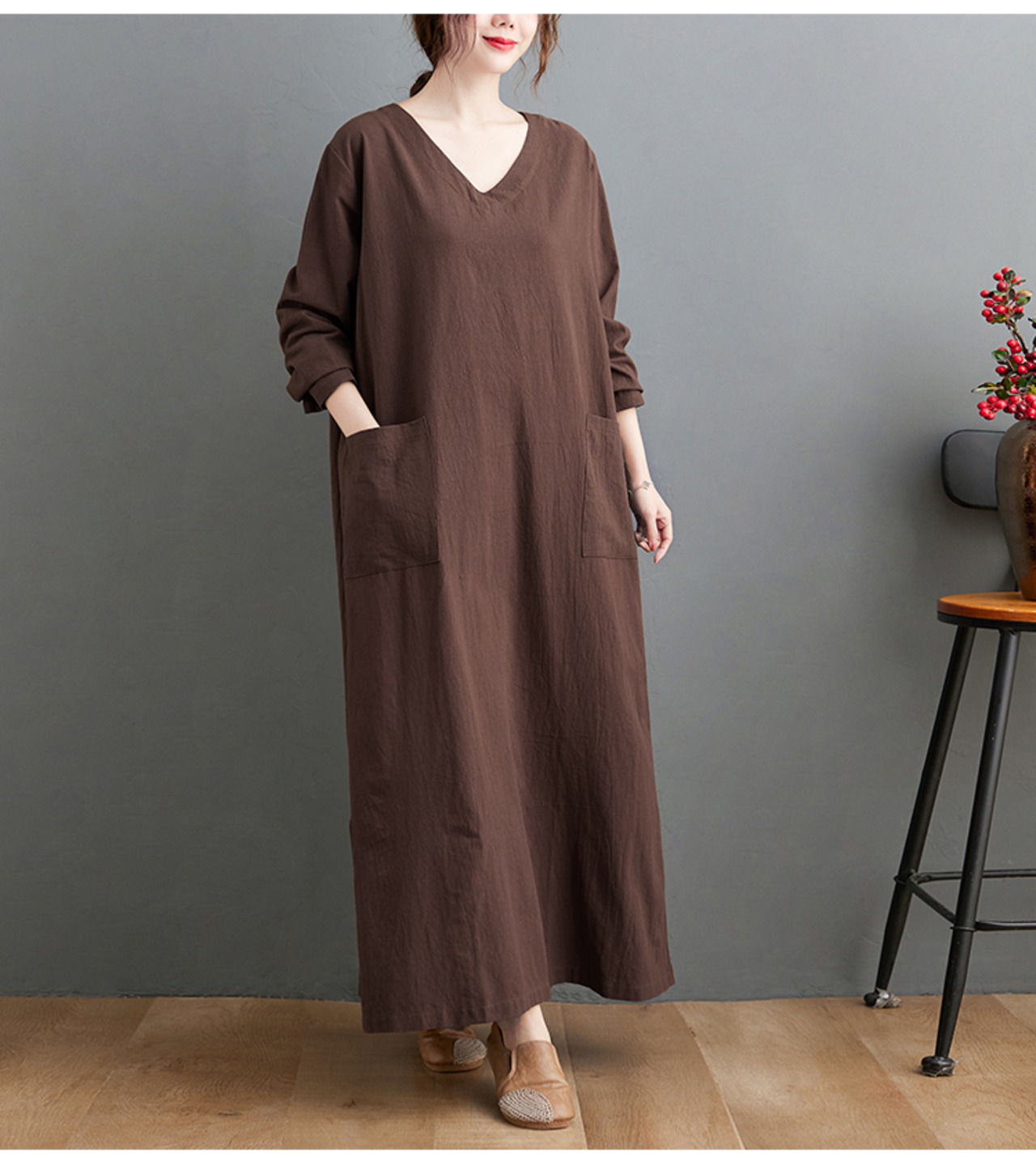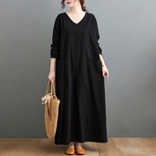 ワンピース 部屋着 ロングスカート ワンピドレス ロング丈 袖あり 長袖 Vネック ワイド スマート 綿 リネン 薄手 大人可愛い きれいめ シンプル 大人 上品 おしゃれ 大人女子 ラフ クール 抜け感 無地 春 秋 30代 40代 50代 レディース 女性用 お出かけ 公園デビュー 女子会 休日 リゾート 着回し 普段使い 楽ちん 体系カバー フリーサイズ 大きい ゆったり ブラック ブラウン