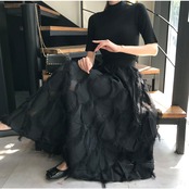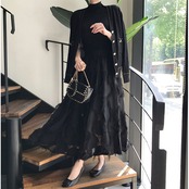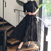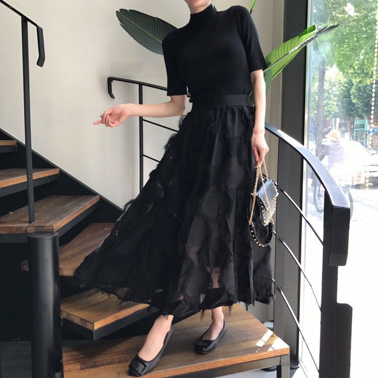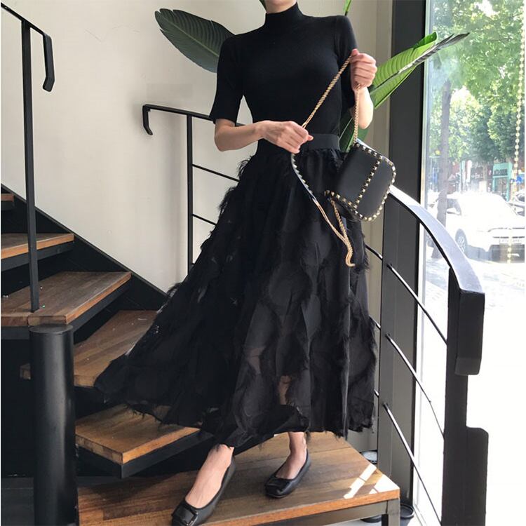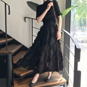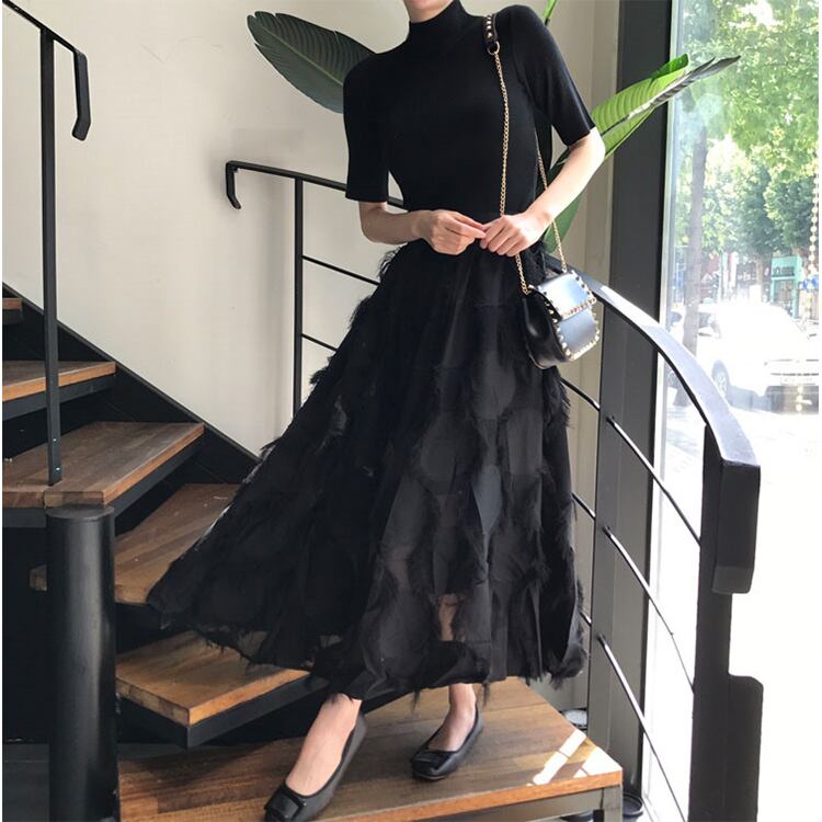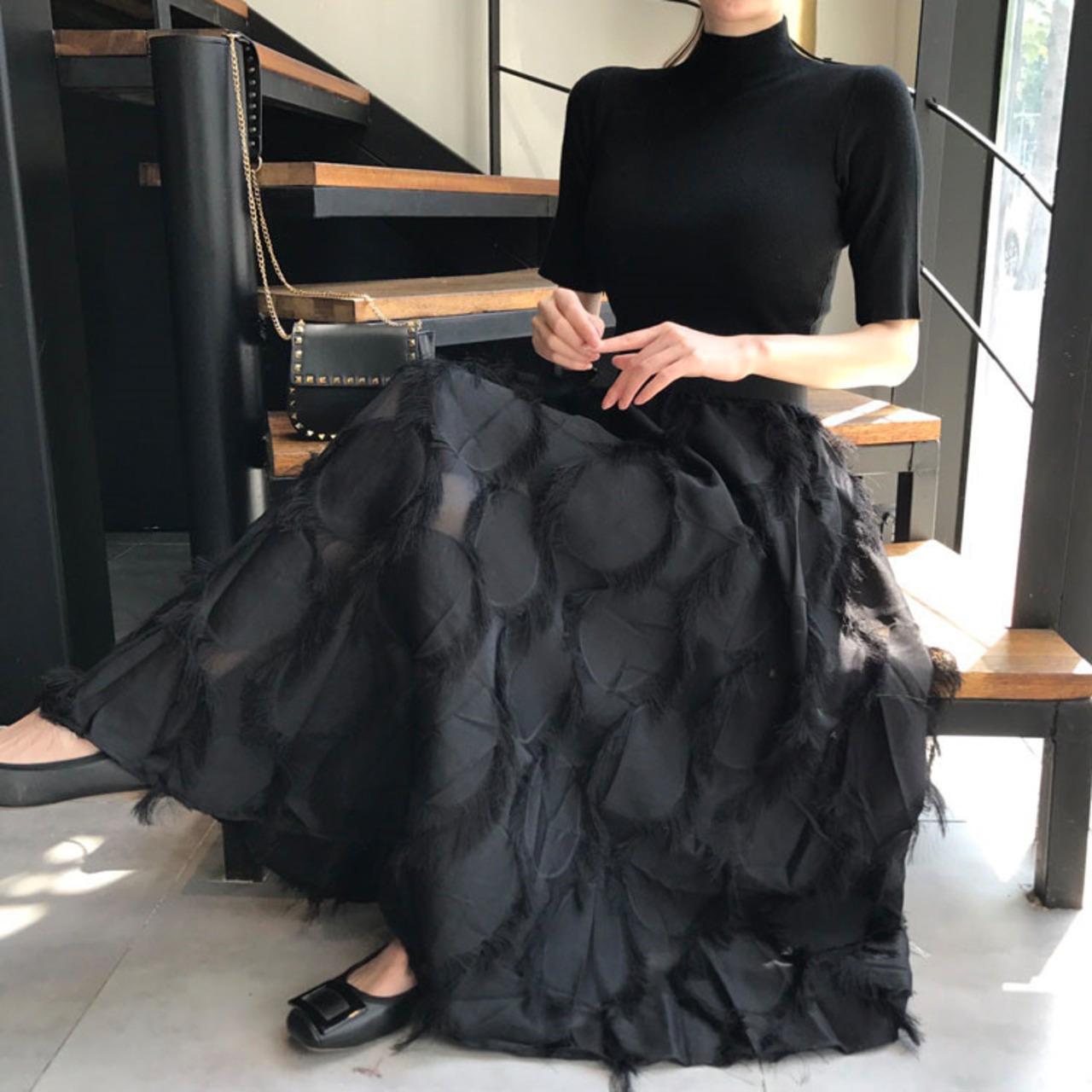 スカート ワンピース ワンピドレス アンクル丈 袖あり 5分袖 ハイネック 襟なし Aライン フリル 透け感 異素材MIX きれいめ 大人 上品 おしゃれ お洒落 レトロ 大人女子 個性的 セクシー エレガント 主役級 存在感 水玉 春 夏 秋 二次会 10代 20代 30代 40代 レディース デート お出かけ 休日 パーティー イベント リゾート 旅行 ホテル ガーデン レストラン 普段使い S M L XL 黒 ブラック