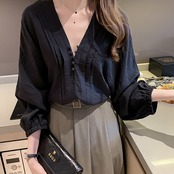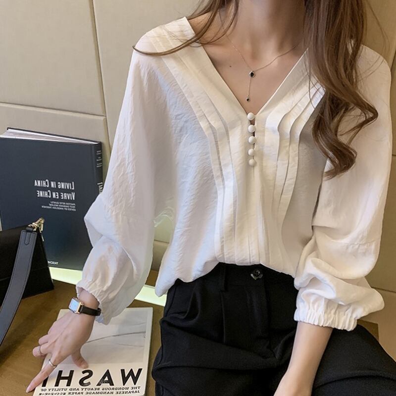 トップス シャツ ブラウス 白シャツ 白トップス 袖あり 長袖 パフスリーブ Vネック 襟なし プリーツ ボタン タック かわいい 大人可愛い きれいめ シンプル カジュアル 大人 上品 おしゃれ お洒落 大人女子 キュート ガーリー エレガント 抜け感 フェミニン 無地 春 秋 レディース 女性用 学生 通学 デート お出かけ 着回し 普段使い モテ 体系カバー プレゼント ギフト 大きいサイズ プラスサイズ ビッグサイズ 大きめ