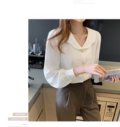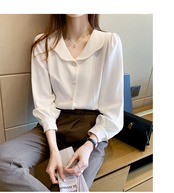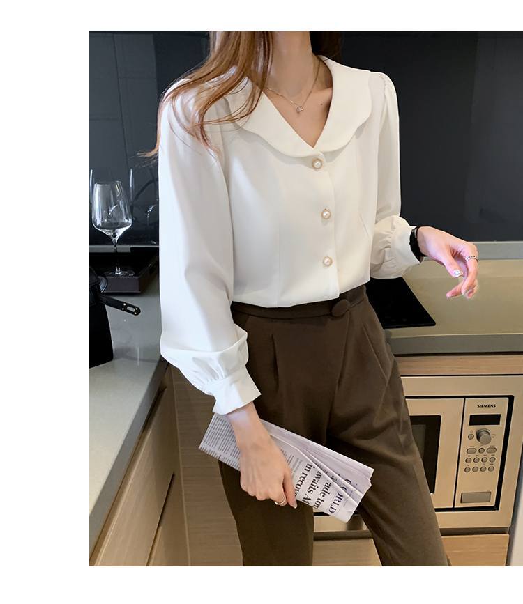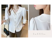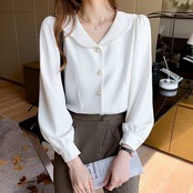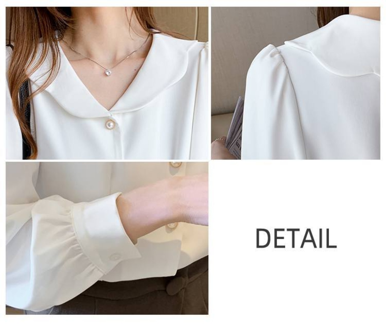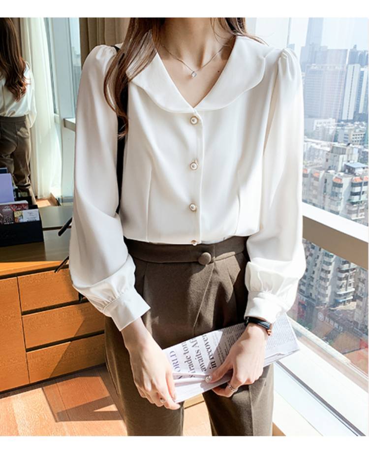 花びらのような襟とパフスリーブがロマンチックで可愛い、シフォンシャツです。
