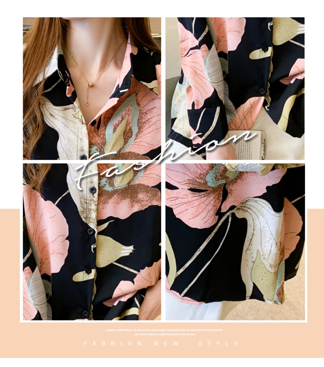 ブラックの生地にピンクのボタニカル柄が映える、華やかな柄シャツです。