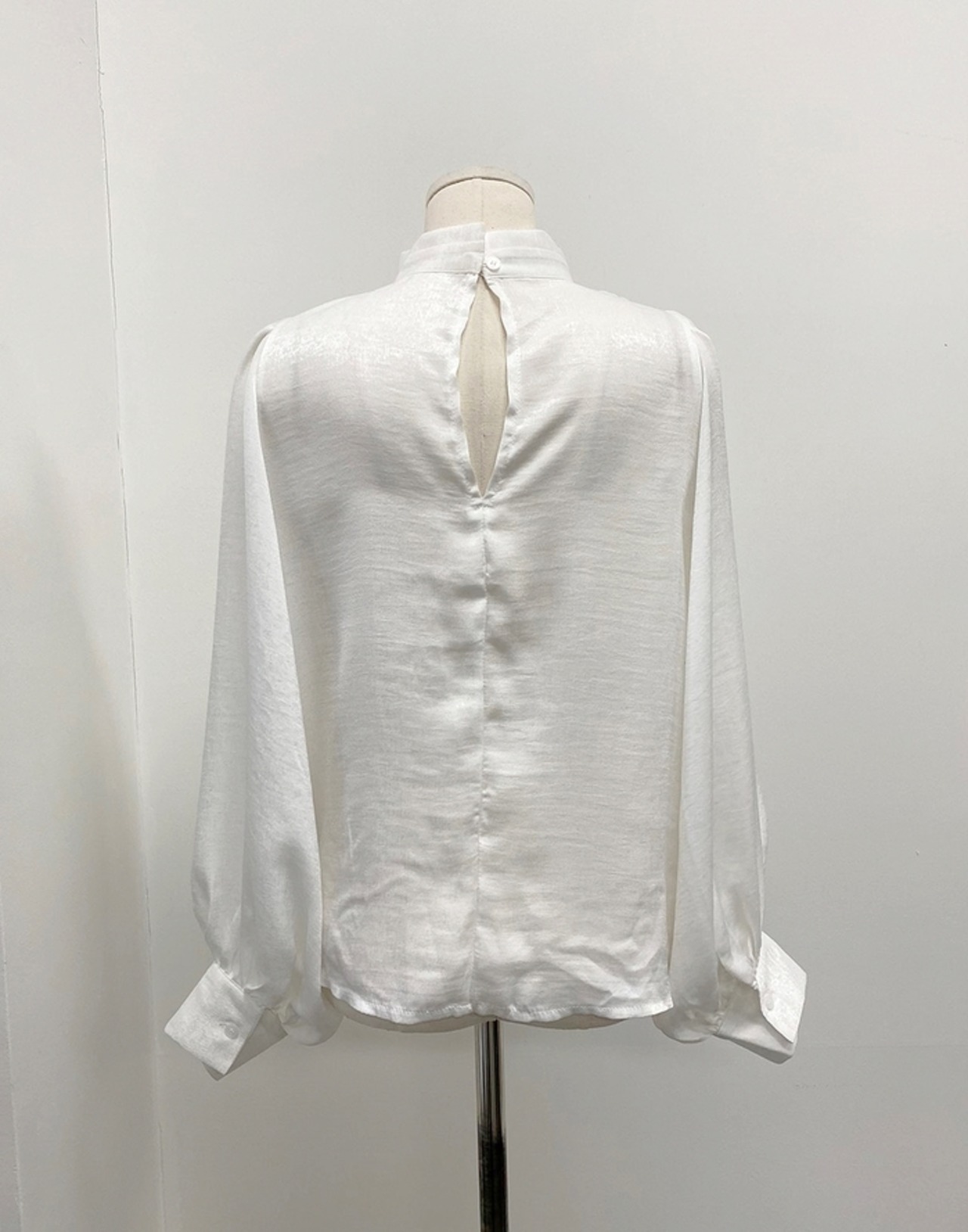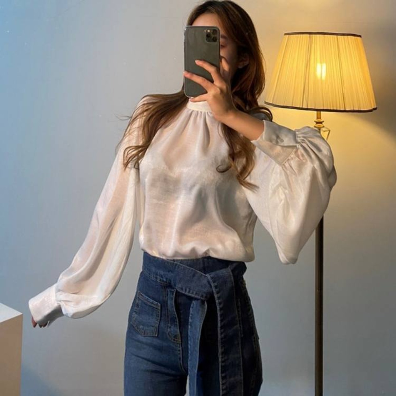 トップス シャツ ブラウス 白シャツ 白トップス 袖あり 長袖 ボリューム袖 パフスリーブ バルーンスリーブ ハイネック リブ 透け感 光沢感 かわいい 大人可愛い きれいめ シンプル カジュアル 大人 上品 おしゃれ お洒落 エキゾチック 大人女子 キュート ガーリー ルーズ クール セクシー エレガント モダン とろみ感 抜け感 フェミニン 無地 春 秋 レディース 女性用 デート お出かけ 着回し 普段使い 楽ちん モテ 体系カバー プレゼント ギフト プチプラ 安い ゆったり ゆる