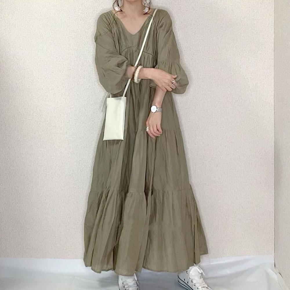ワンピース フレアワンピース ティアードワンピース ロング ロング丈 マキシ マキシ丈 袖あり 長袖 Vネック フレア セミフレア Aライン 大人可愛い シンプル カジュアル 大人 上品 おしゃれ お洒落 こなれ感 ラフ ラブリー キュート ガーリー 主役級 存在感 春 秋 2022 2023 10代 20代 30代 40代 50代 60代 レディース 女性用 女の子 お出かけ 休日 普段使い コーデ スタイル 楽ちん フリーサイズ カーキ
