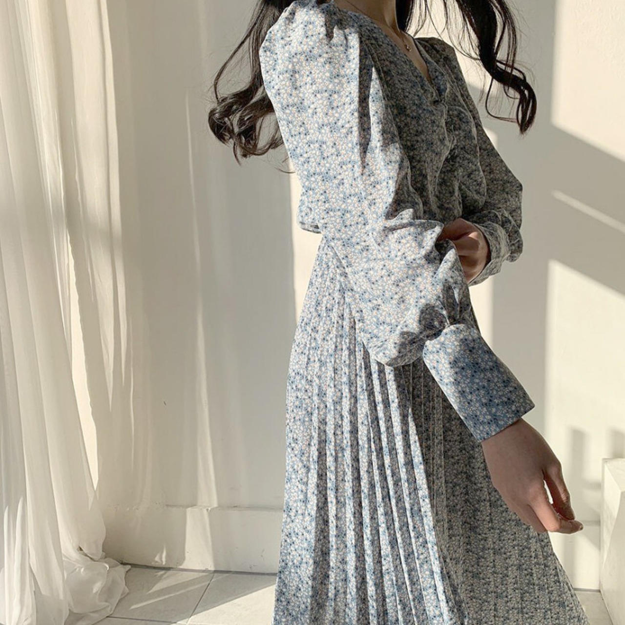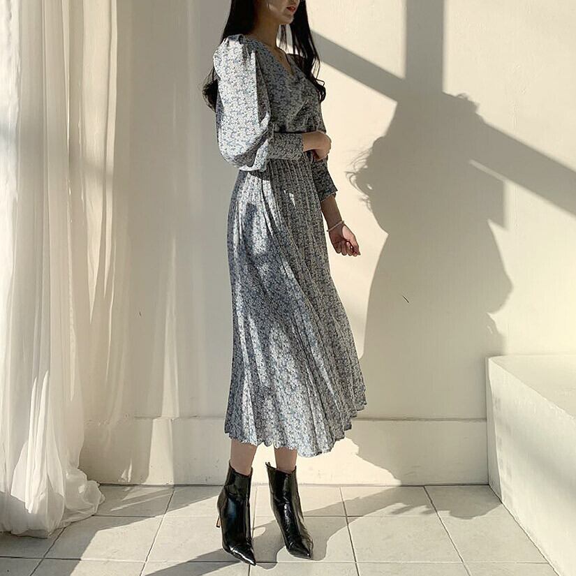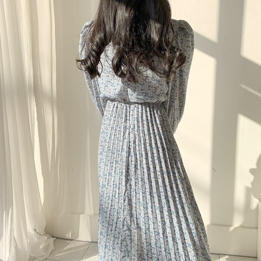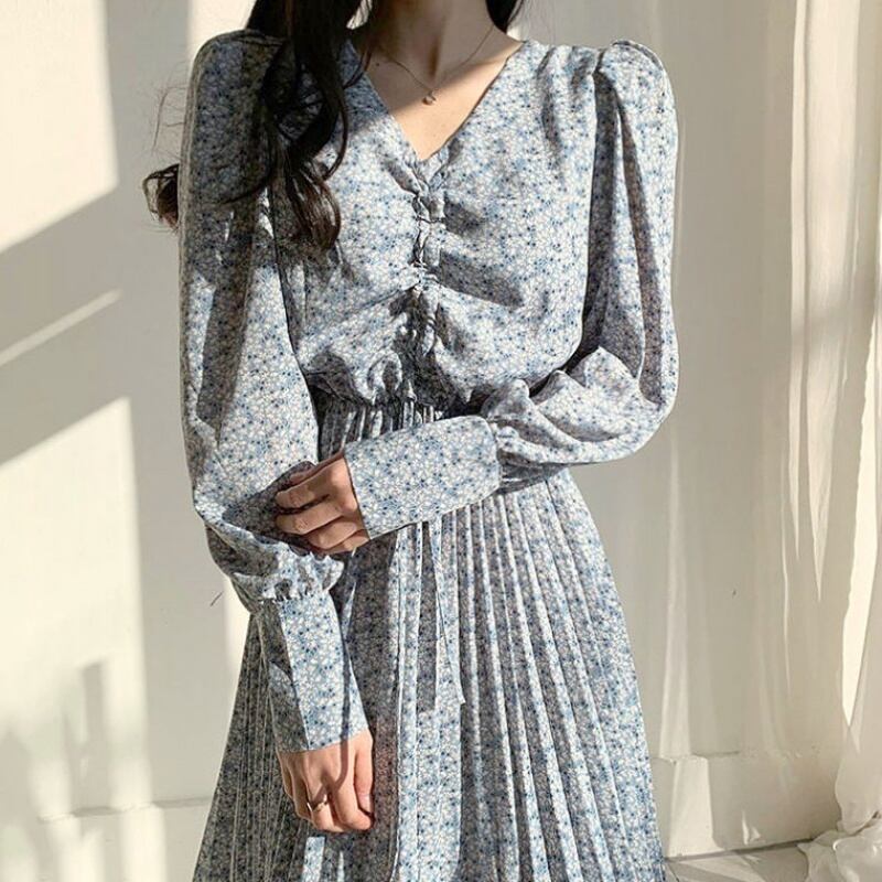 ワンピース プリーツスカート フレアワンピース ミモレ ミモレ丈 袖あり 長袖 Vネック マーメイド 大人可愛い きれいめ 大人 上品 おしゃれ お洒落 レトロ 大人女子 こなれ感 ラブリー キュート ガーリー ルーズ 花柄 小花柄 フラワー 春 秋 冬 2022 2023 10代 20代 30代 40代 レディース 女性用 キッズ 女の子 通学 デート お出かけ 休日 普段使い 重ね着 M L XL 2XL 3XL 4XL 青 ブルー