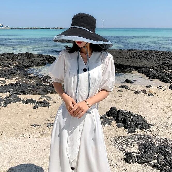 帽子 ハット サマーハット つば広 日よけ フラットトップ 紫外線対策 バイカラー ストラップ 首紐 折り畳み可能 おしゃれ エレガント 上品 大人可愛い 大人女子 きれいめ お出かけ リゾート レジャー ビーチ 海 春 夏 レディース