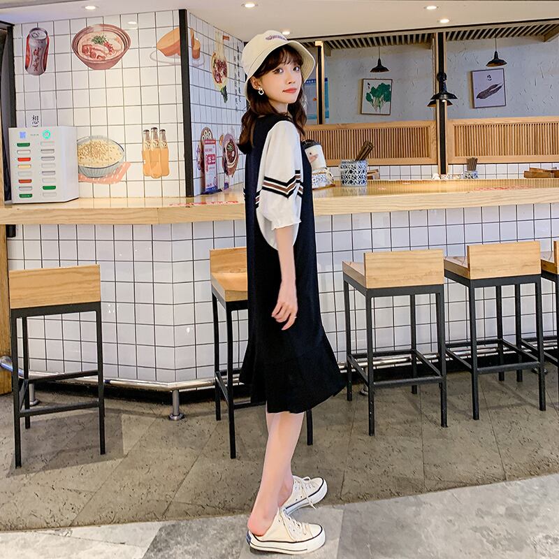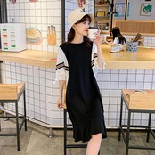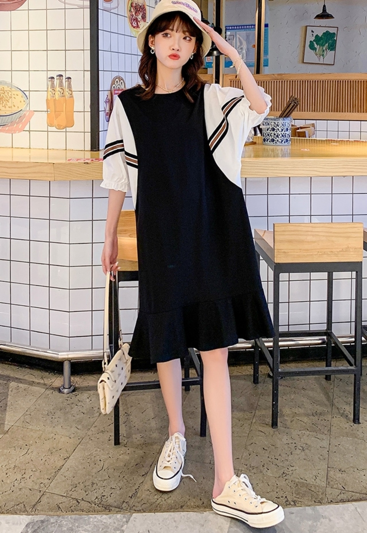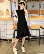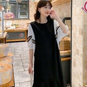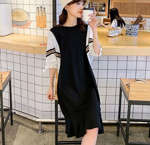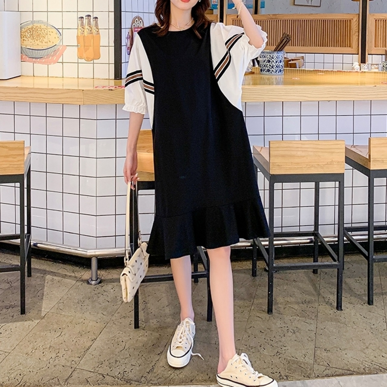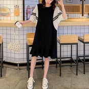 ワンピース Tシャツワンピース ミックスデザイン フェイクツーピース ラウンドネック 半袖 パフスリーブ 裾フリル ミディアム丈 ひざ丈 フレア レトロ 大人女子 大人可愛い オシャレ おしゃれ お洒落 きれいめ カジュアル お出かけ デート デイリー 普段使い ランチ カフェ 休日 春 夏 10代 20代 30代 40代 大きいサイズ レディース