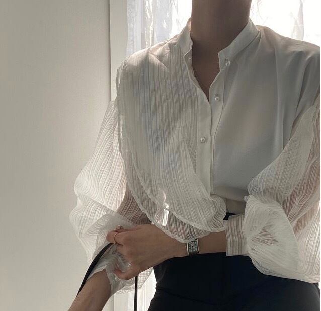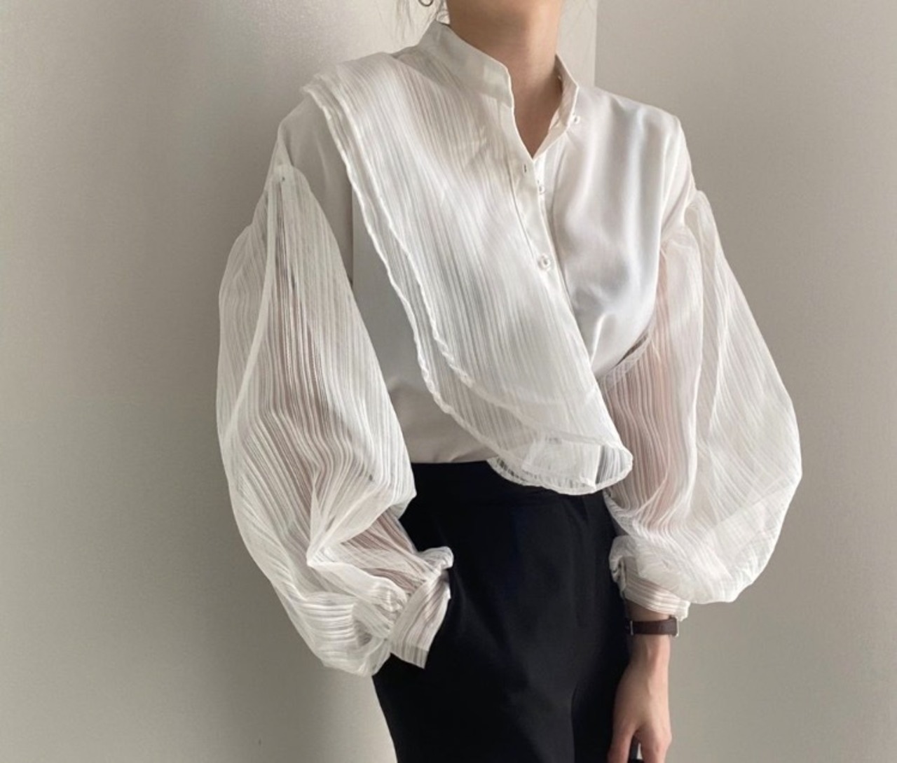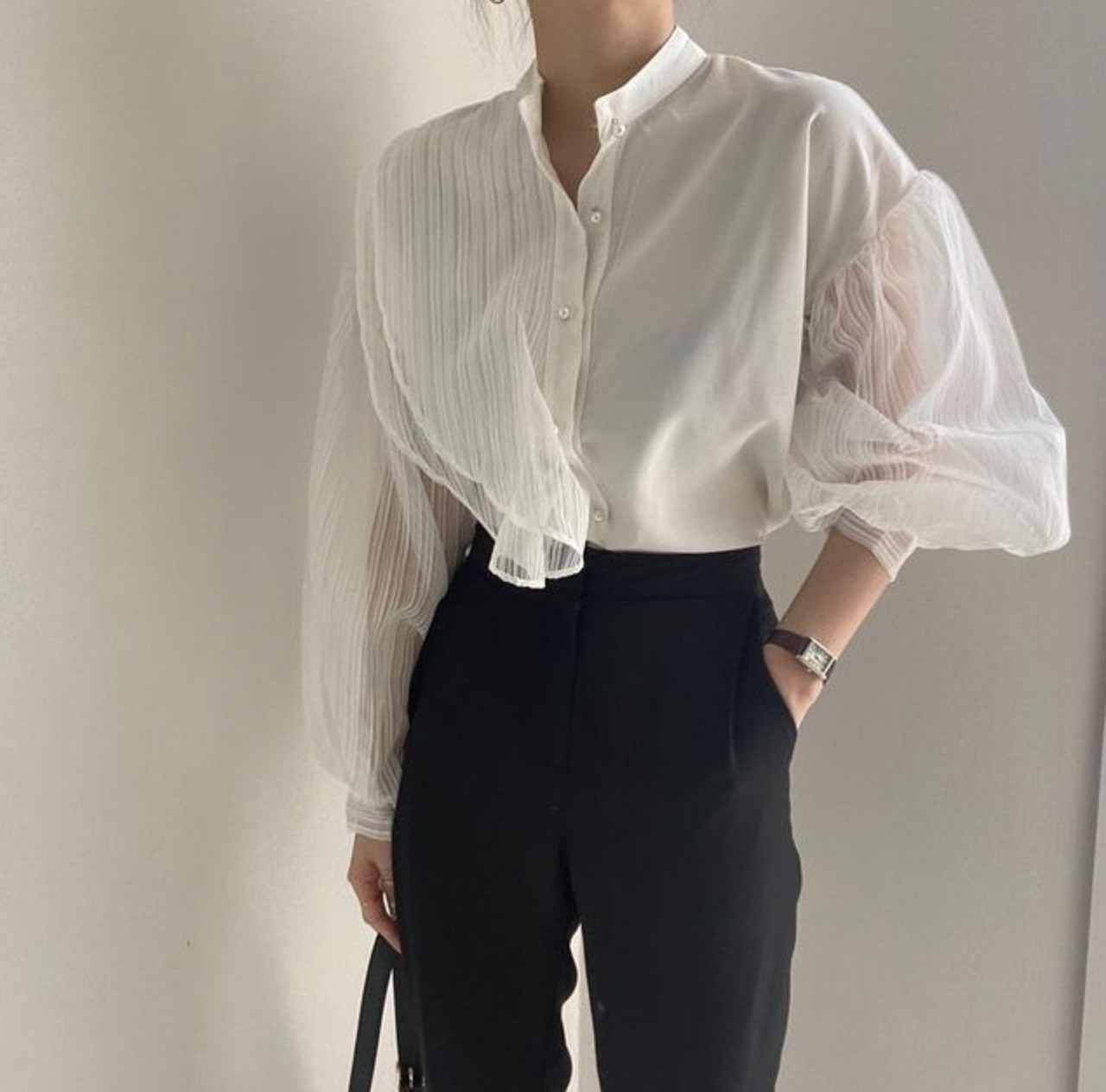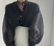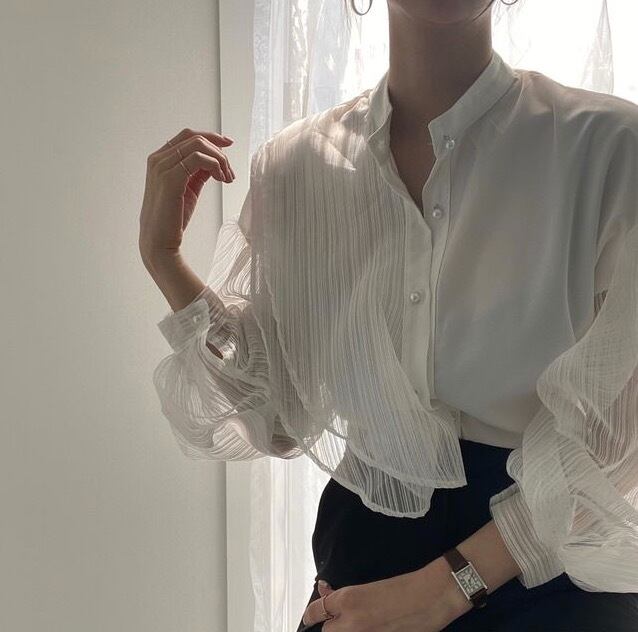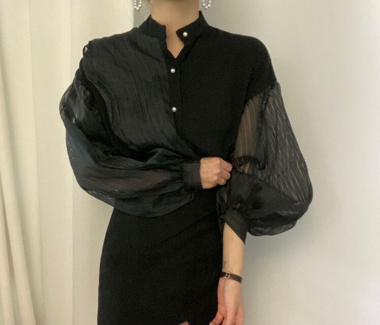 袖の透け感とボリューム感が女性らしさを演出してくれます。