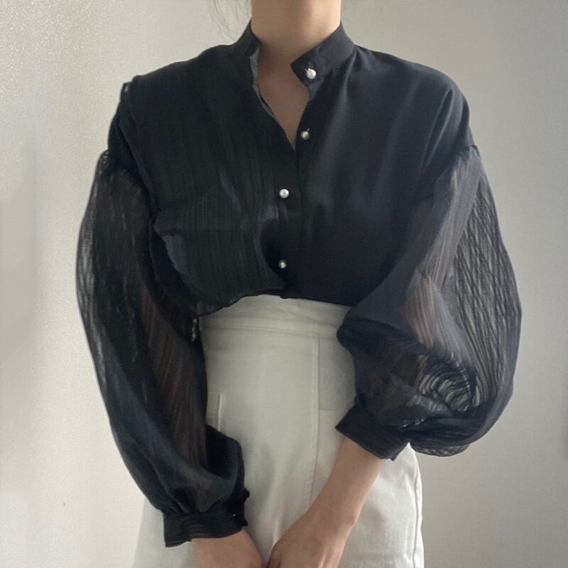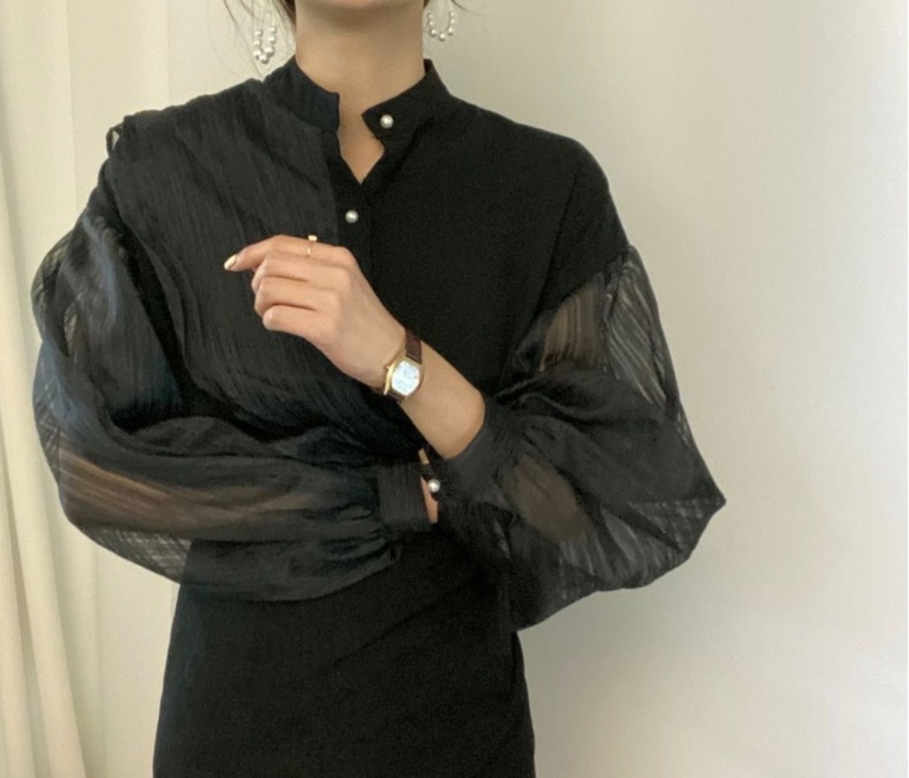 パールボタンが特徴のスタンドカラーのブラウスです。