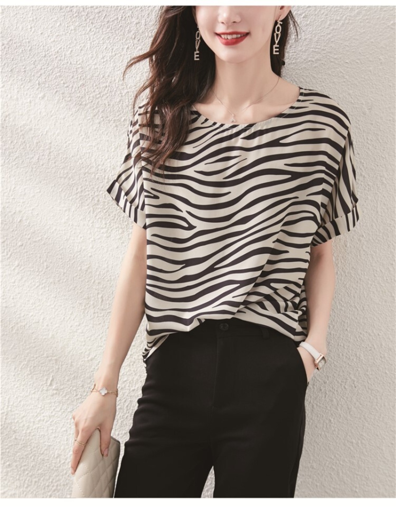 派手見えしがちなゼブラ柄トップスですが、コーデ全体をモノトーンでまとめるとバランスよく落ち着きます。