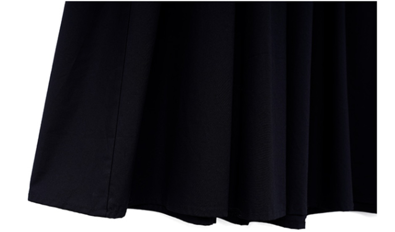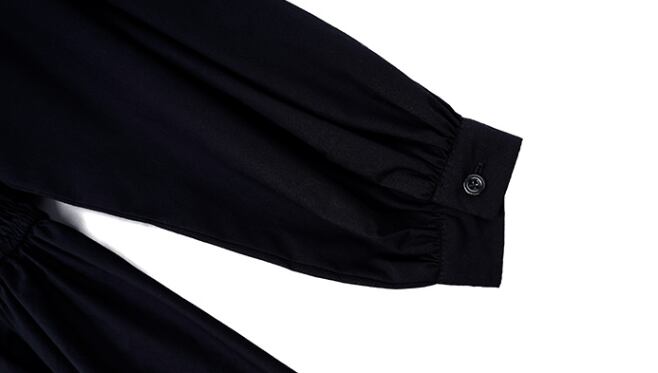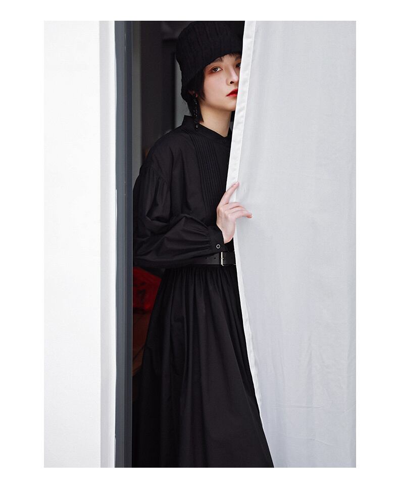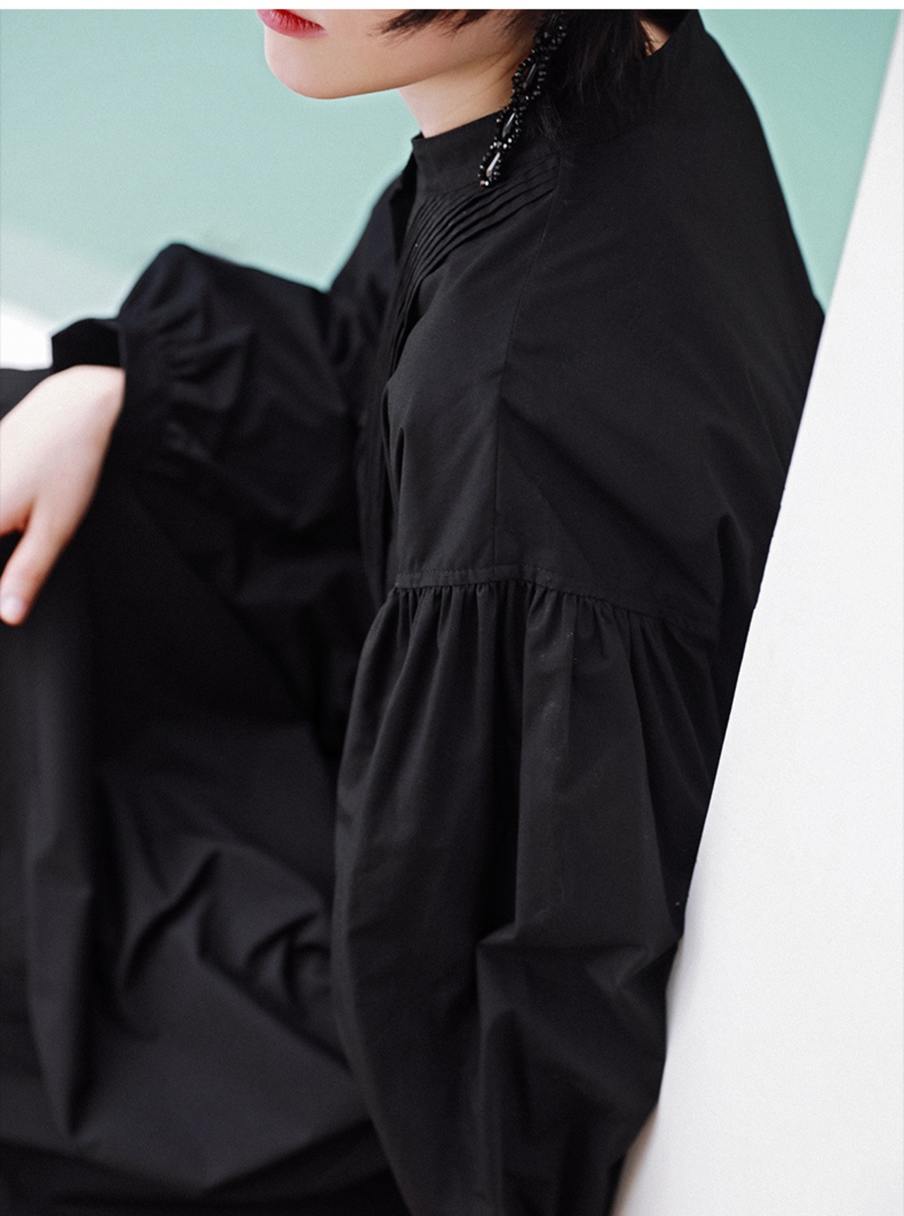 ワンピース ロングスカート マキシ丈 袖あり ボリューム袖 パフスリーブ スタンドカラー Aライン プリーツ ギャザー 綿 異素材MIX 大人可愛い 大人 個性的 クール 無地 20代 30代 40代 レディース お出かけ 休日 アウトドア 小さいサイズ 大きいサイズ 黒 ブラック
