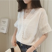 レースをあしらったエレガントなシルエットのVネックブラウス。