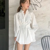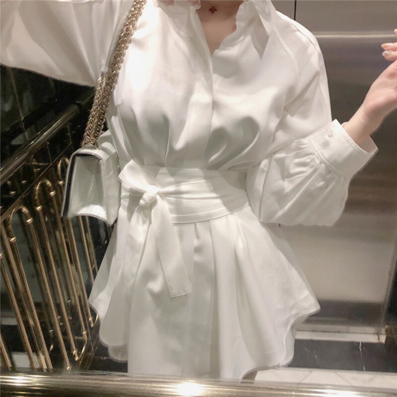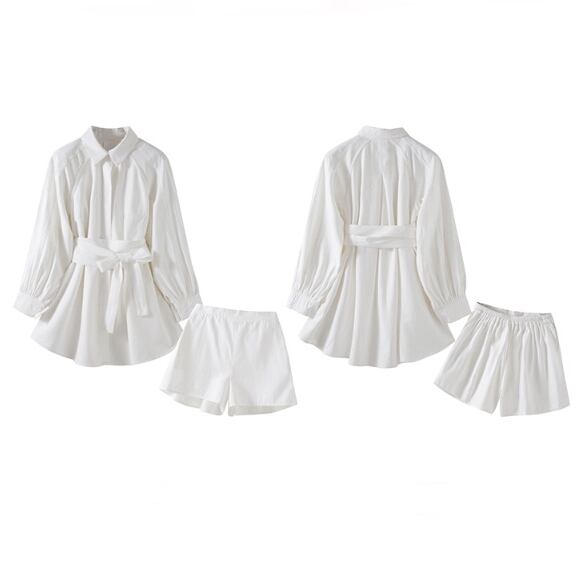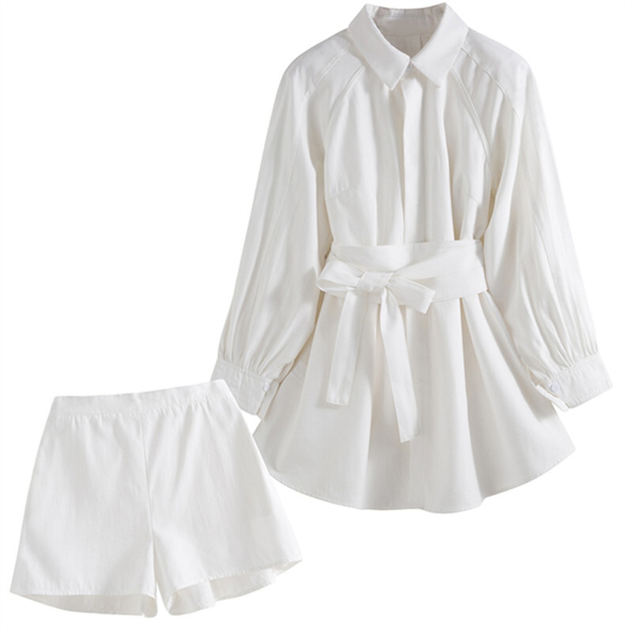セットアップ ツーピース シャツ チュニック 無地 ショートパンツ 2点セット 長袖 パフスリーブ ボリューム袖 ハイウエスト ウエストマーク リボンベルト Aライン 着回し 大人女子 上品 フェミニン きれいめ カジュアル お出かけ ランチ カフェ リゾート 旅行 春夏秋 10代 20代 30代 レディース