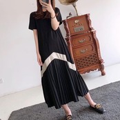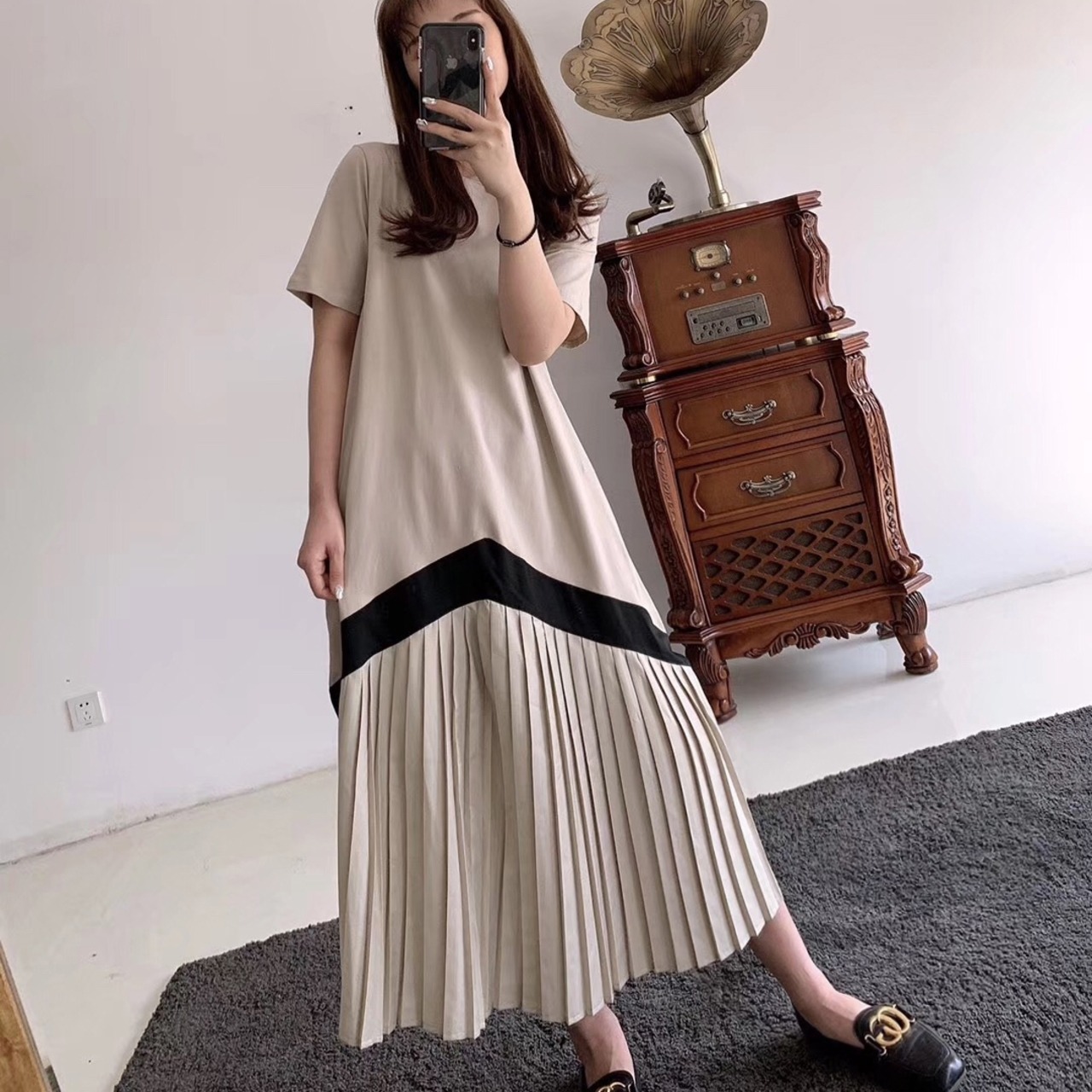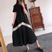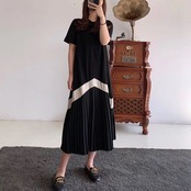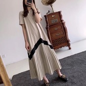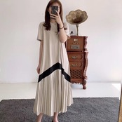 ワンピース ドレス プリーツ 切替デザイン ラウンドネック 半袖 ロング丈 フレア Aライン バイカラー レトロ ゆったり 体型カバー 大人女子 オシャレ おしゃれ お洒落 きれいめ カジュアル お出かけ デート デイリー 普段使い ランチ カフェ 女子会 リゾート レジャー 休日 春 夏 10代 20代 30代 40代 レディース