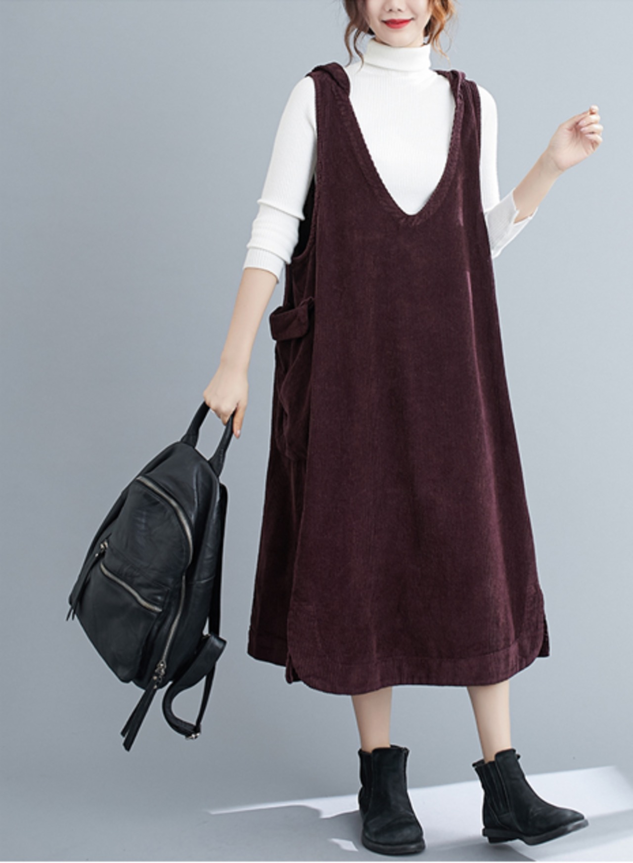 コーデュロイ生地を使った、フードワンピース。