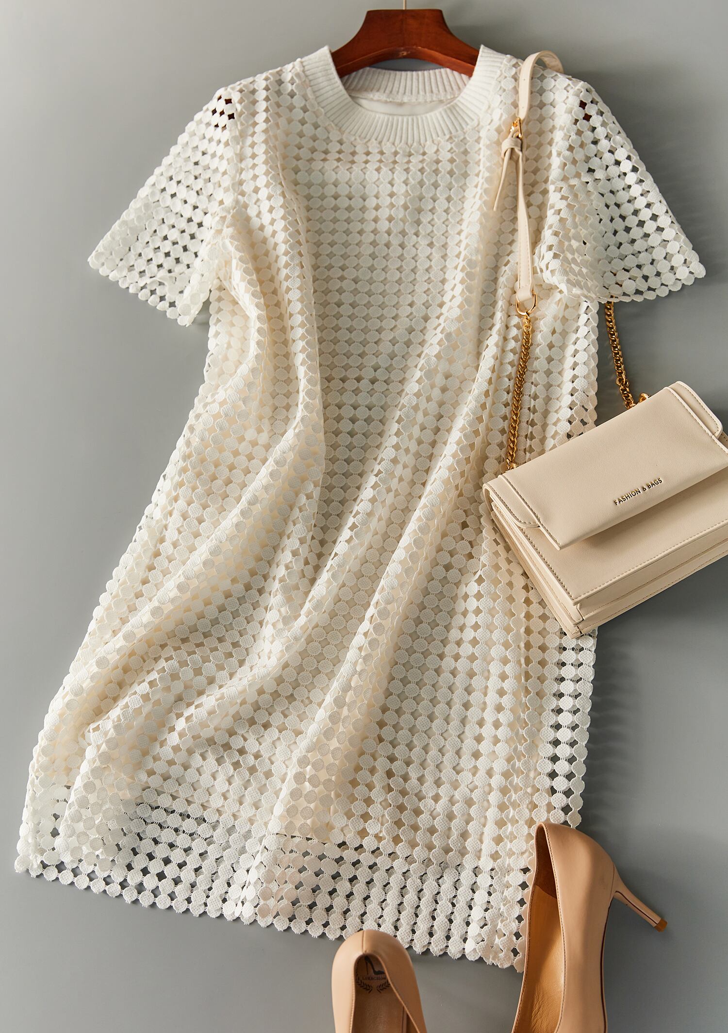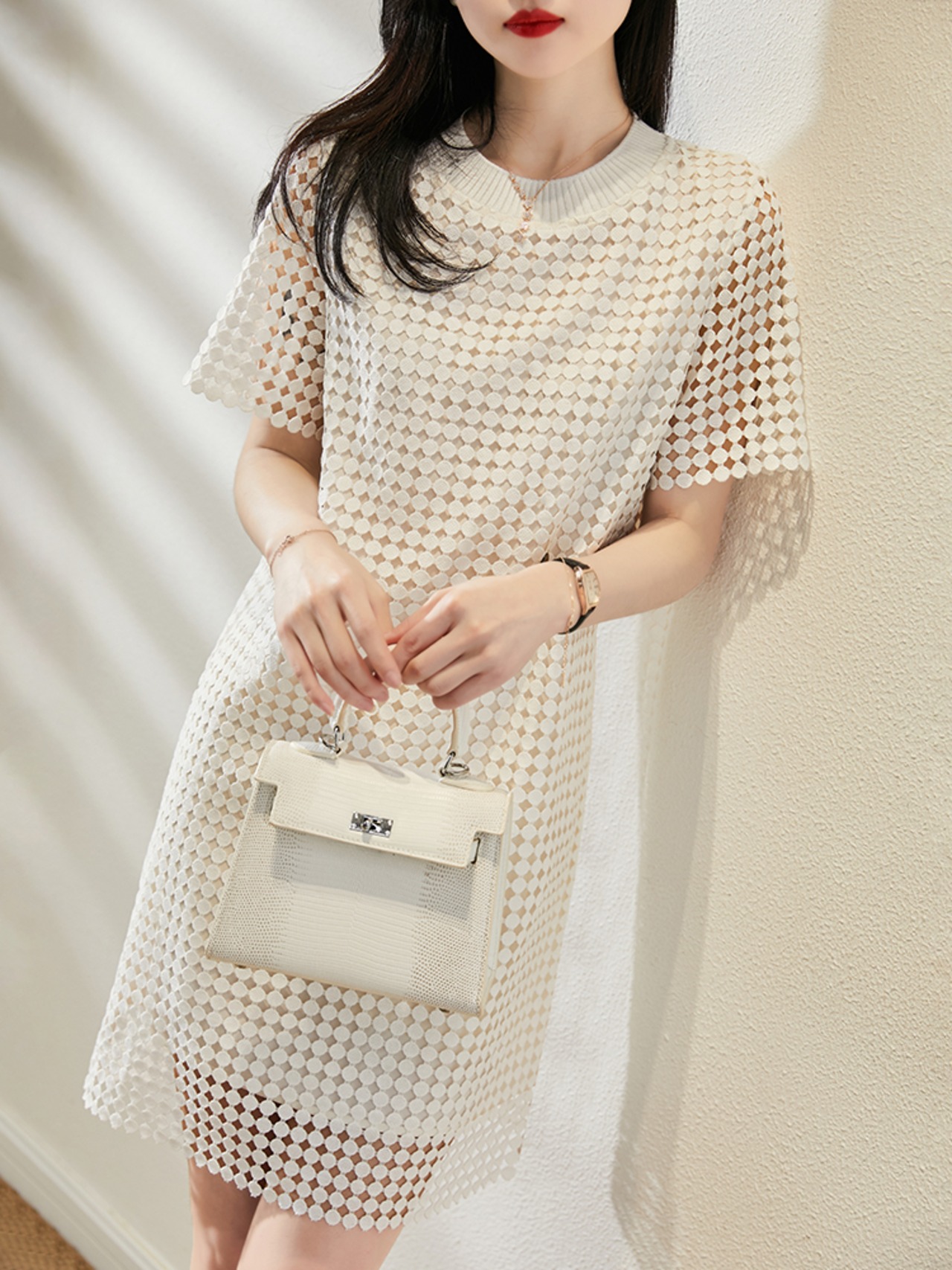 ワンピース ニットワンピ Iライン 膝上 半袖 ラウンドネック レース ドット柄 水玉 かわいい 大人可愛い きれいめ シンプル カジュアル 大人 上品 おしゃれ フェミニン かっこいい レトロ さわやか 大人カジュアル 大人女子 キュート 個性的 存在感 ナチュラル クラシカル ロマンティック 春 夏 レディース OL 学生 デート お出かけ 女子会 お泊まり 休日 イベント 旅行 着回し 普段使い コーデ 美脚 脚長