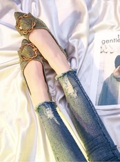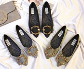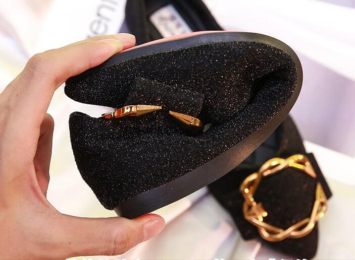 ツイストしたバックルがおしゃれなキラキラのフラットパンプスです。