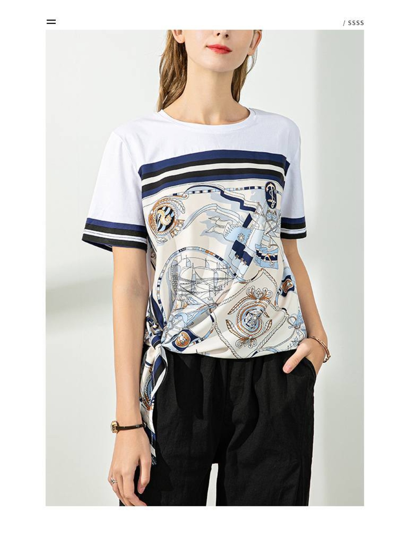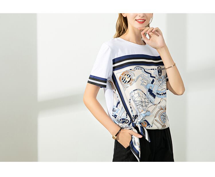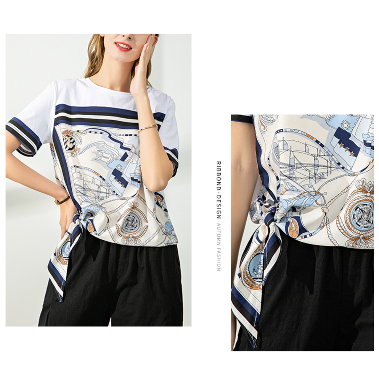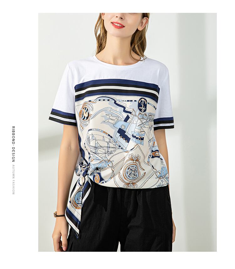 上品な色遣いとサイドの裾を結んだデザインが大人可愛いTシャツです。