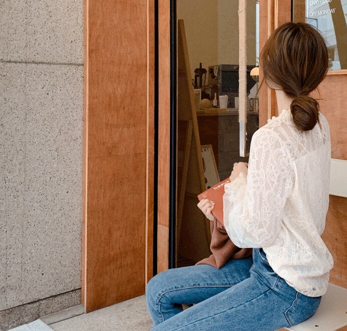 パフスリーブやハイネックが可愛らしさを引き立てる総レースブラウスです。