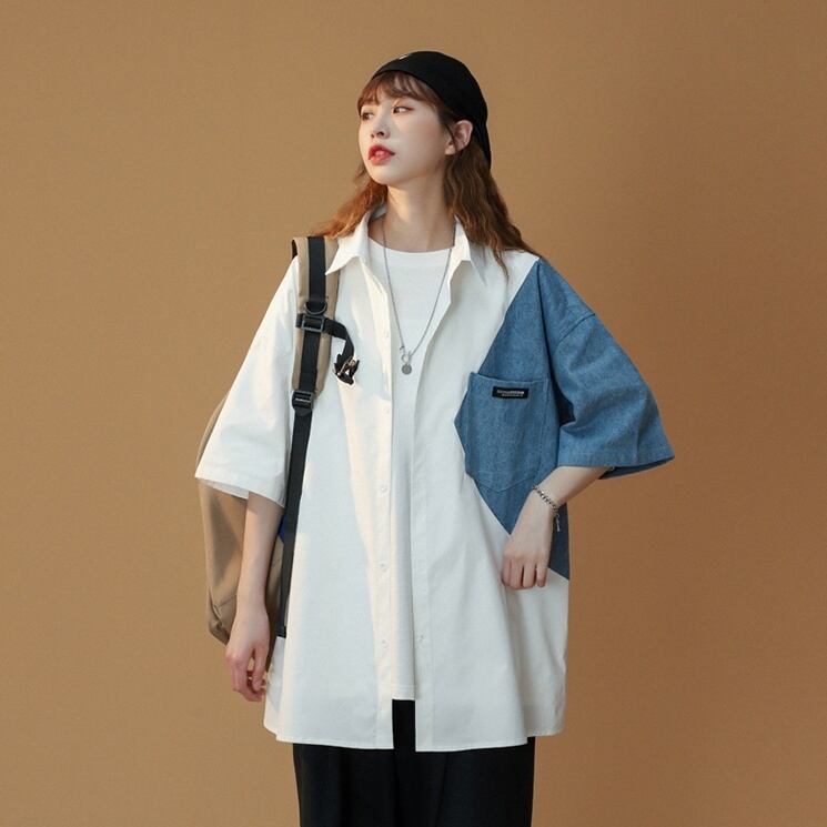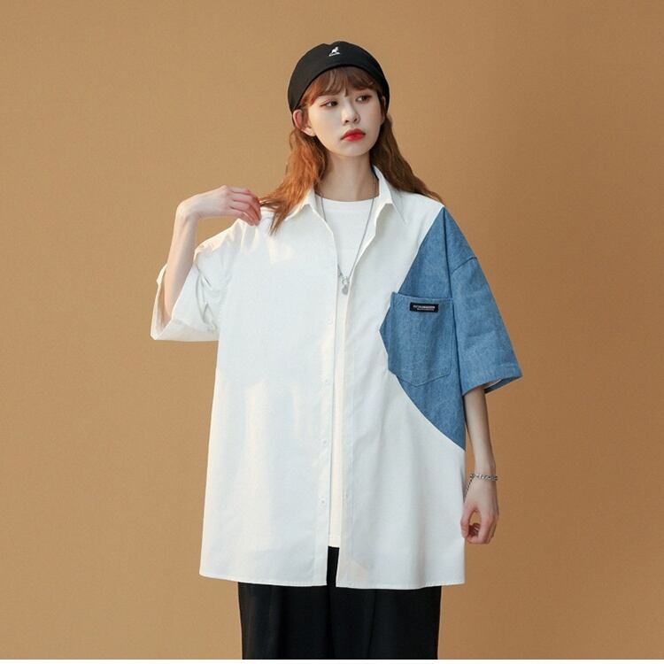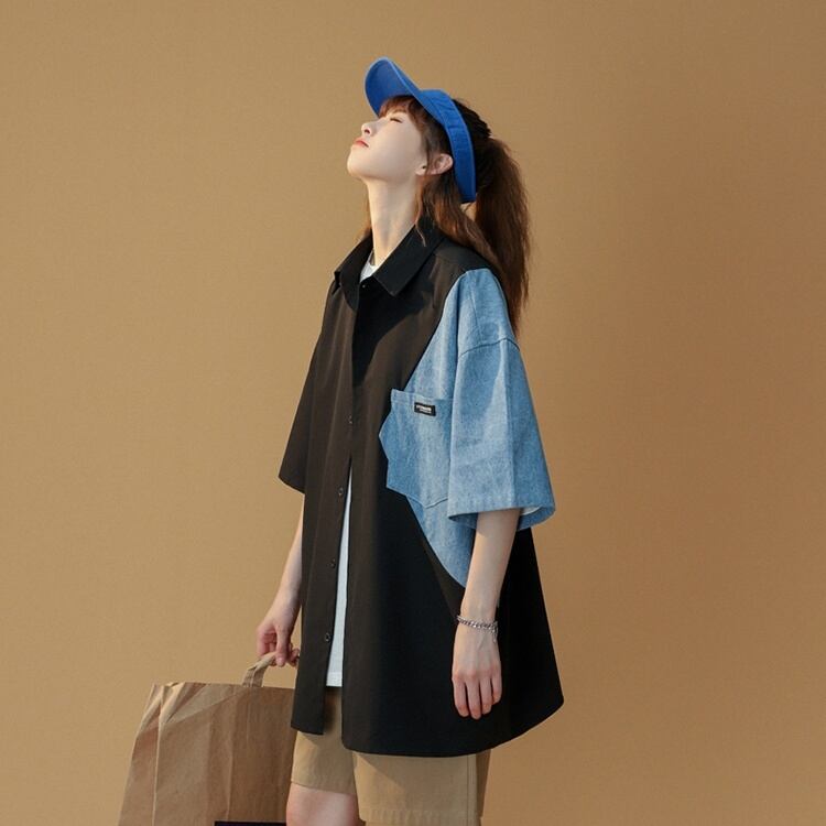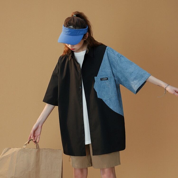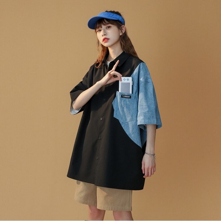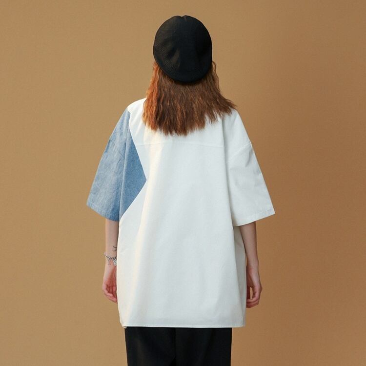 不規則なデニムデザインを生地に切り替えたドッキングシャツです。