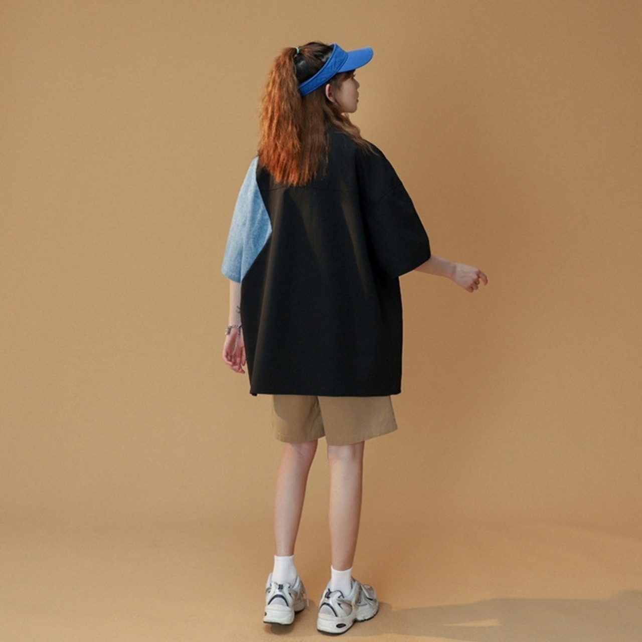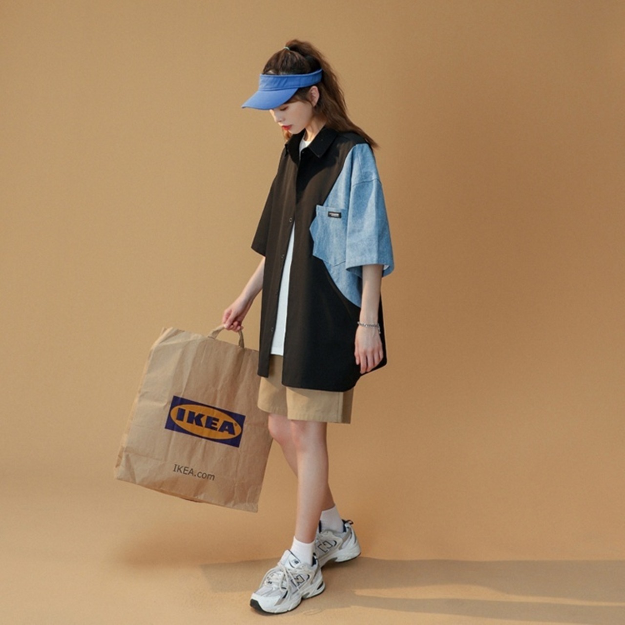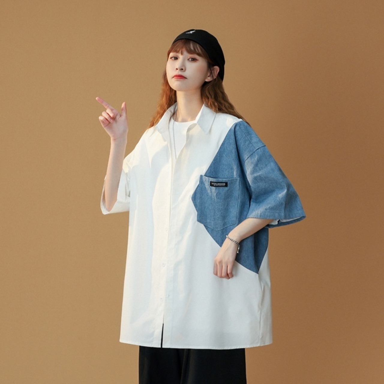 不規則なデニムデザインを生地に切り替えたドッキングシャツです。