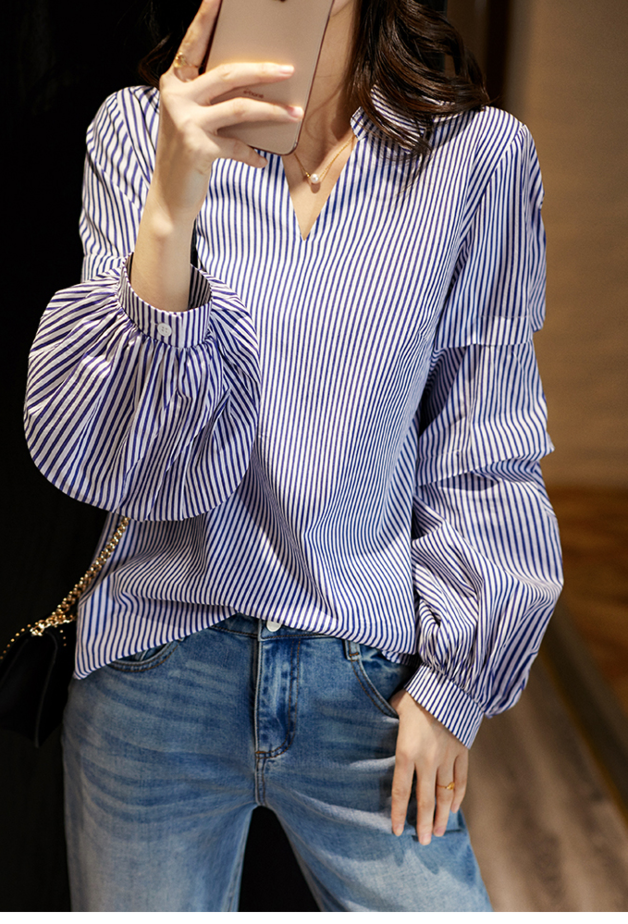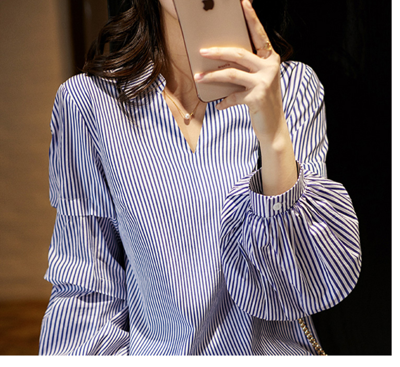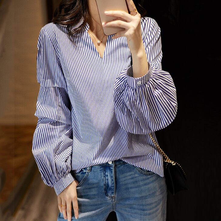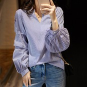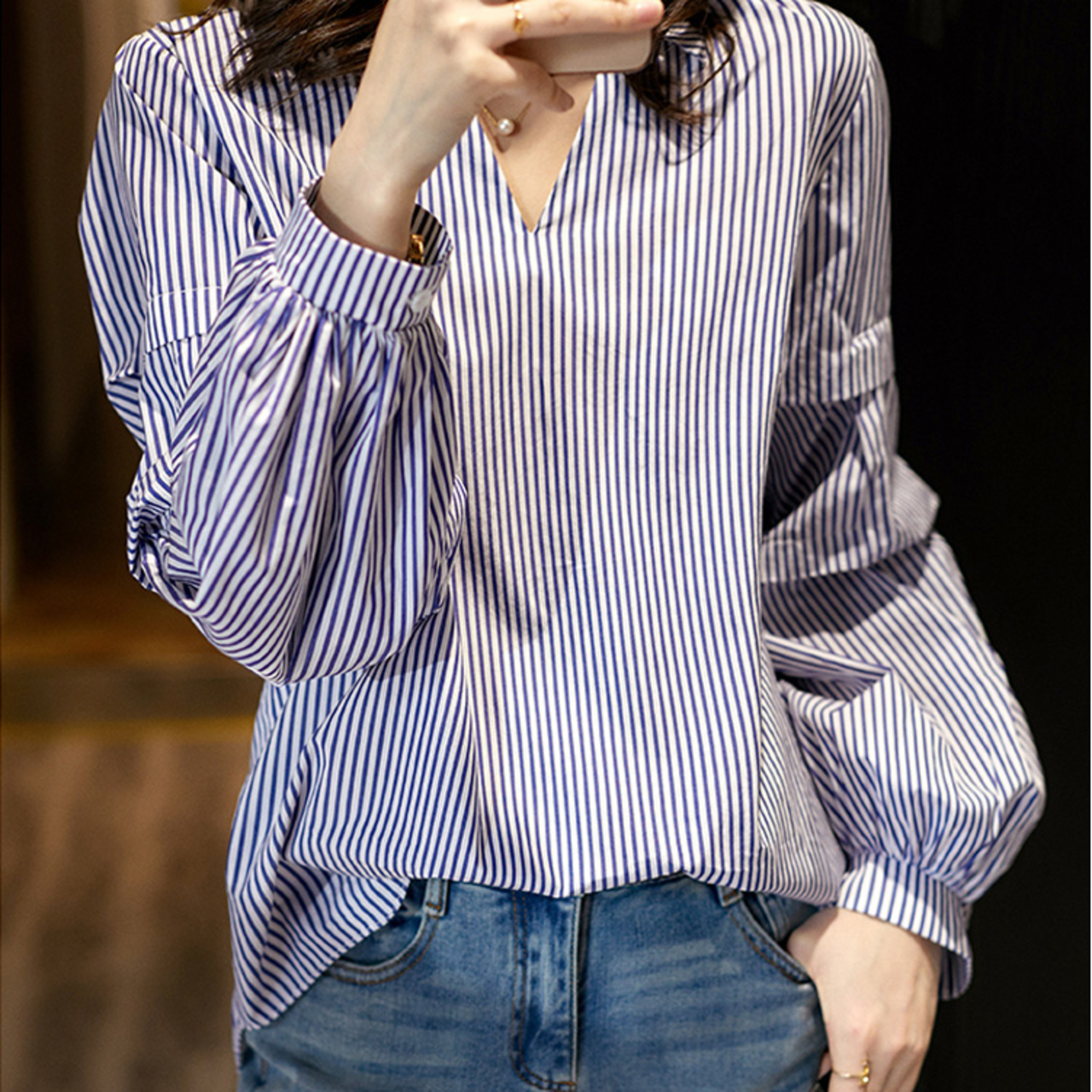 シャツ ブラウス 長袖 スキッパー ランタンスリーブ ストライプ かわいい 大人可愛い きれいめ シンプル カジュアル 大人 上品 おしゃれ レトロ 大人カジュアル 大人女子 こなれ感 キュート クール エレガント 存在感 とろみ感 抜け感 ベーシック 春 秋 冬 レディース ママ OL 通勤 学生 通学 デート お出かけ 公園デビュー 女子会 お泊まり 旅行 リモート会議 着回し 普段使い 美デコルテ デイリー スタイルアップ コーデ 体型カバー きちんと感 日常使い 休日