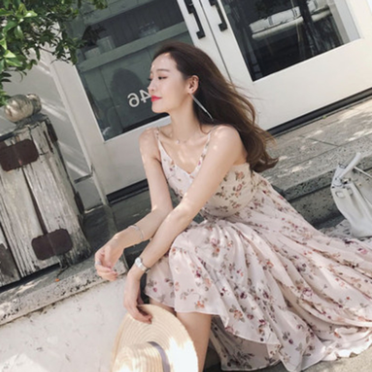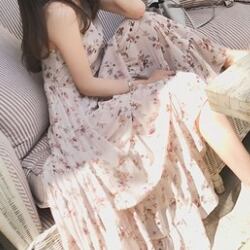 ニュアンスカラーと花柄の組み合わせがキュートなロングワンピース。
